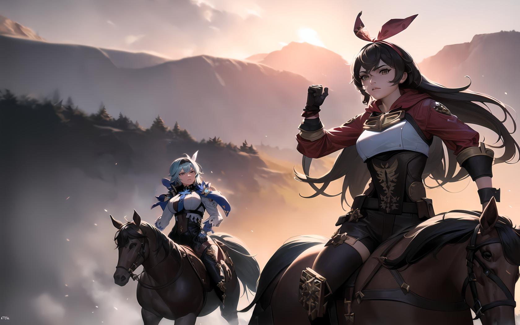 | Prompt | (detailed:1.5), (epic, heroic:1.5),(style of Greg Rutkowski:1.5), (perfect artwork), best quality,sharp focus,(8k), (4k),(Masterpiece), (Best Quality), fantasy, extremely detailed, intricate, hyper detailed, (perfect face), illustration,soft lighting, Ultra detailed fantasy environment, clearly worked out detail, intricate, cinematic,(depth of field), (moody lighting:1.2), photorealistic, octane render,(hyperrealistic:1.2),(photorealistic face:1.2),(1girl:1.4),(skindentation:1.3), <lora:eula2:1>euladef, (1girl, solo),long brown hair,headband, outdoors, sunrise, autumn, trees,wind, ( forest), ((mist)), (front of a medieval castle), (riding armored galloping horse:1.3), ((dynamic, speed, speed effect:1.4)), (hands on horse), serious, focused,angry, (looking at viewer:1.3), (cowboy shot), |