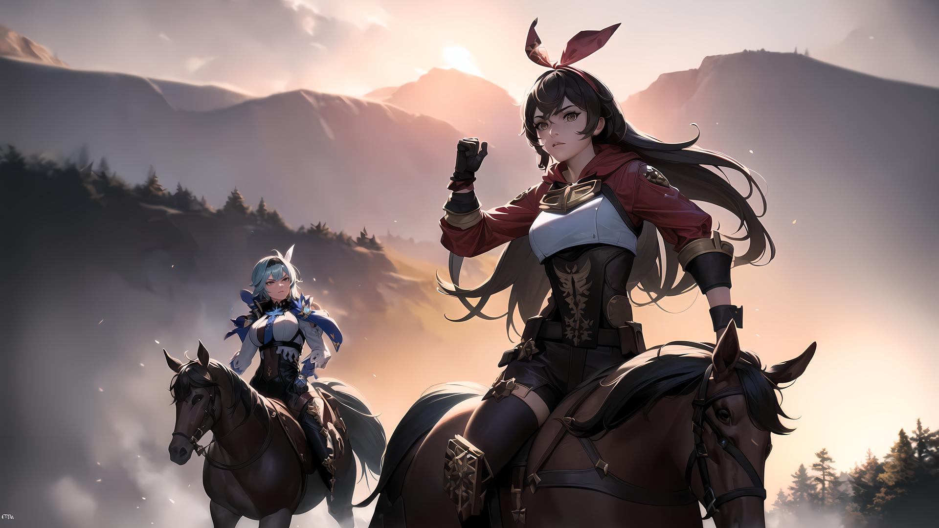 2girls, bangs, black hairband, blue hair, blue necktie, boots, brown eyes, brown hair, cape, corset, gloves, goggles, goggles around neck, hair ribbon, hairband, horse, horseback riding , long hair, long sleeves, mountain, multiple girls, necktie, outdoors, pouch, red ribbon, ribbon, riding, short shorts, shorts, thigh boots, thighhighs, underbust