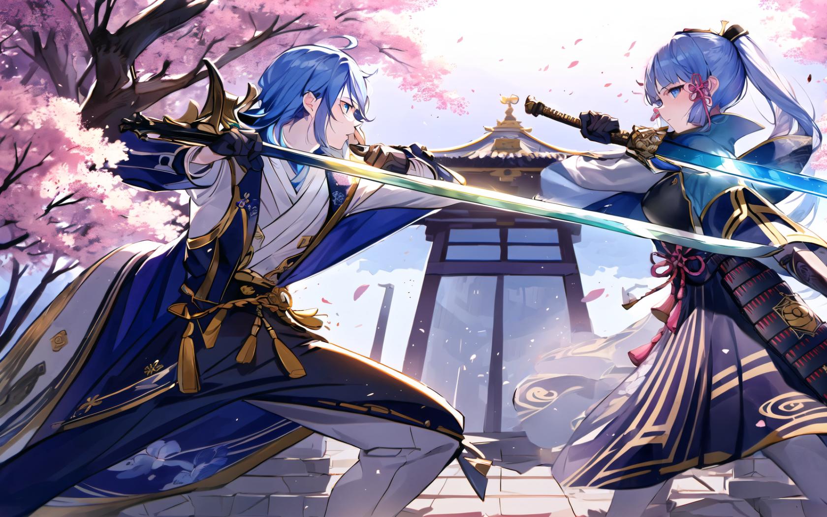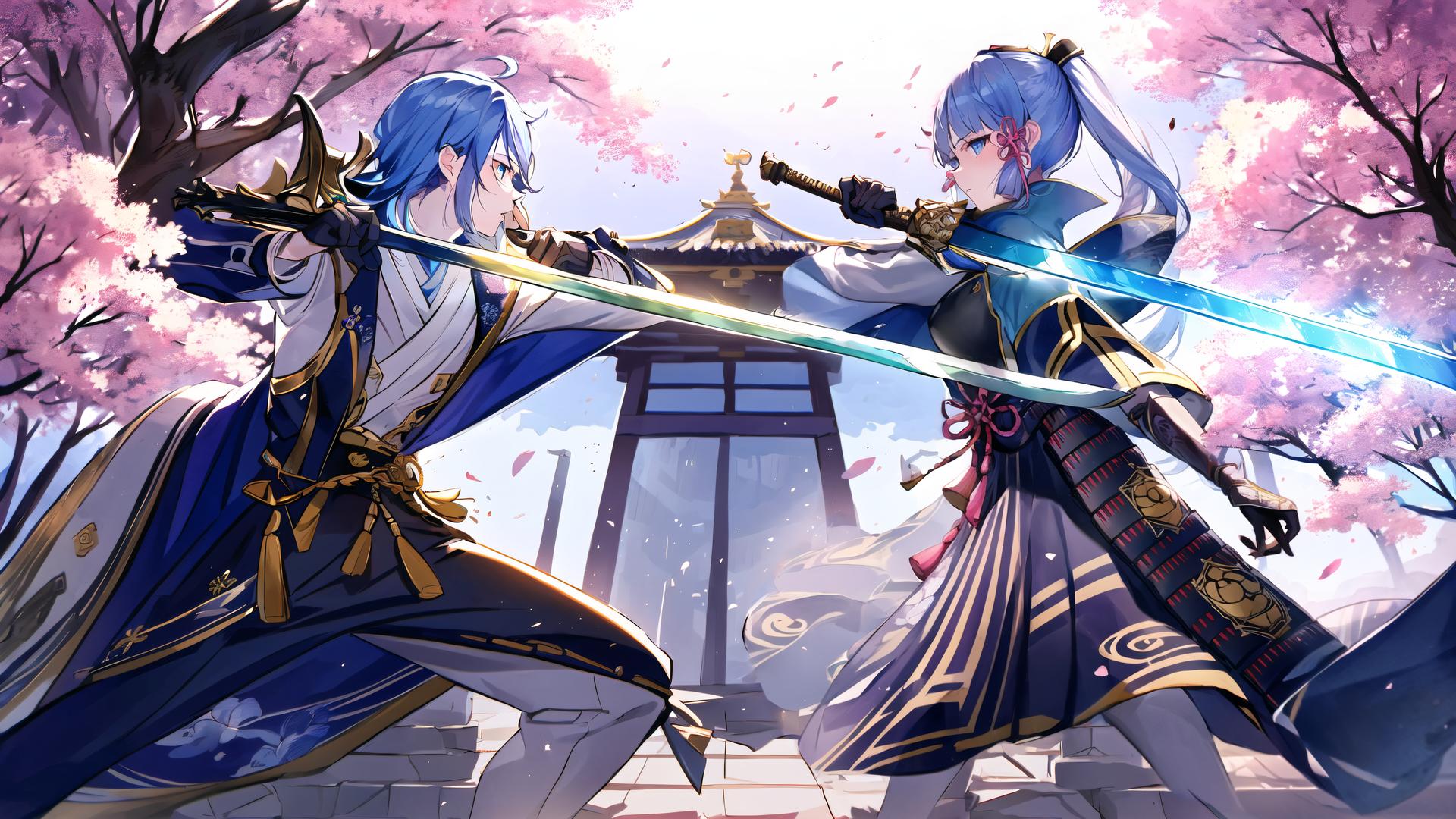 1boy, 1girl, ahoge, architecture, arm guards, armor, armored dress, bangs, black gloves, blue capelet, blue eyes, blue hair, blunt bangs, breastplate, brother and sister, cherry blossoms, falling petals, gloves, gold trim, hair between eyes, hair ornament, hair ribbon, holding, holding sword, holding weapon, japanese armor, japanese clothes, katana, kusazuri , light blue hair, long hair, long sleeves, looking at another, mole, mole under eye, outdoors, pants, petals, ponytail, profile, ribbon, rope, siblings, sidelocks, skirt, standing, sword, tassel, tree, tress ribbon, weapon, wide sleeves