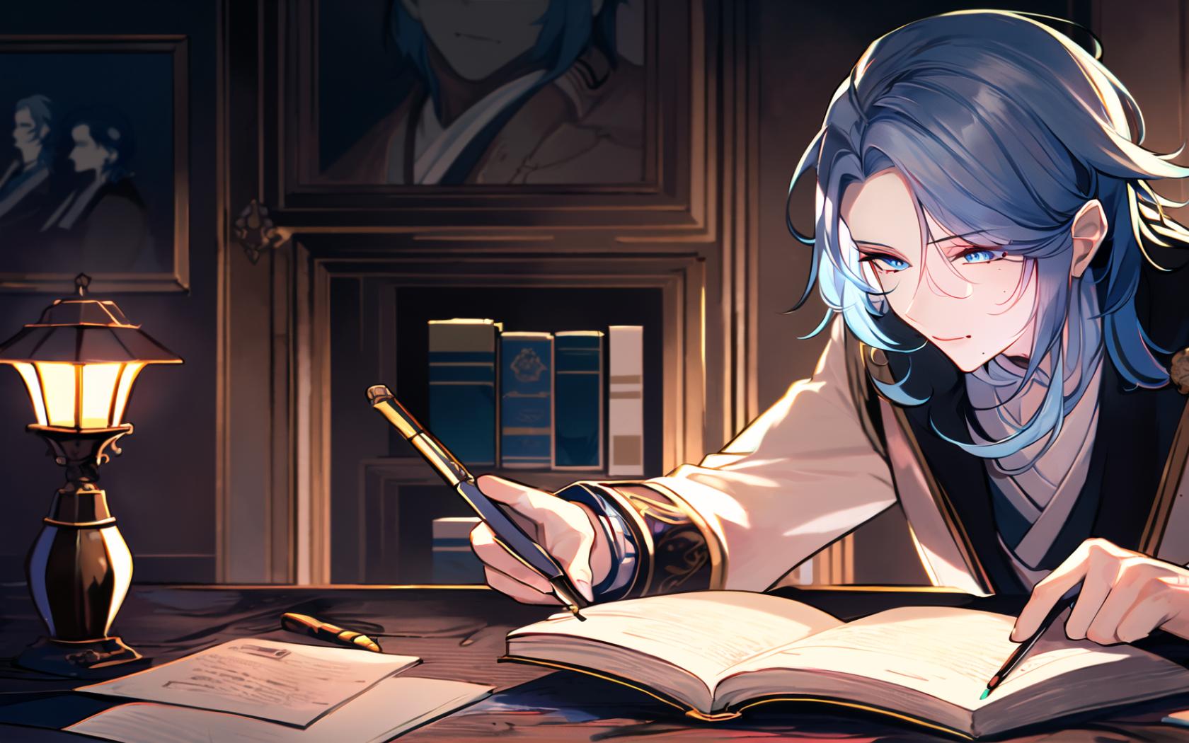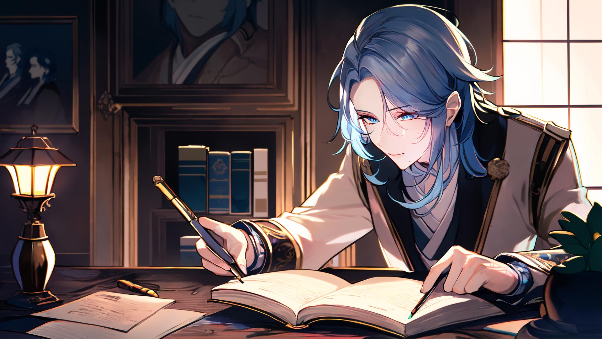 | Prompt | (dramatic1.2),(highly detailed:1.5), (realistic:1.05),(digital art:1.2),(romantic:1.2), (epic:1.1, perfect artwork), best quality,,(8k), (4k),(Masterpiece), (Best Quality), extremely detailed, intricate, hyper detailed, (perfect face), illustration,soft lighting, clearly worked out detail, intricate, cinematic,(depth of field), <lora:ka:1>(1boy:1.2),((blue hair)), (complex details) ,(beautiful and delicate eyes), blue eyes, green pupils, delicate face,mole_under_mouth, messy floating hair, messy hair, (muscular, sexy), sitted at desk, writing, flowers, open books, inside a rich japanse mansion, plants, tapestries, paintings, |