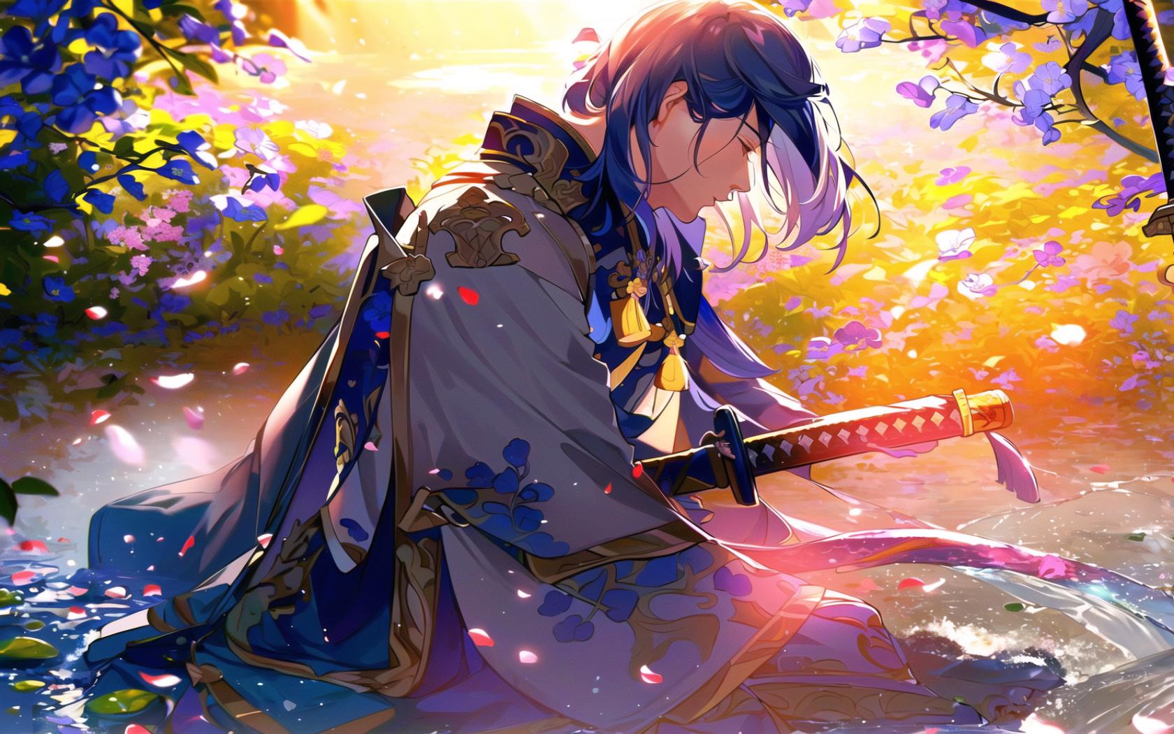 | Prompt | (epic,dramatic1.2),(highly detailed:1.5), (realistic:1.65),(romantic:1.2), ( perfect artwork), best quality,sharp focus,(8k), (4k),(Masterpiece), (Best Quality), fantasy, extremely detailed, intricate, hyper detailed, (perfect face), illustration,soft lighting, Ultra detailed fantasy environment, clearly worked out detail, intricate, cinematic,(depth of field), (dramatic lighting:1.3), rich japanese medieval mansion background,garden, waterfall, sunset, sakura trees, sakura blossoms,flowers, ((green)),grass ((translucid realistic water)), <lora:ka:1>((1boy, solo, male focus)), ((kneeled, side view)), glowing water japanese katana at waist, sad, mourn |