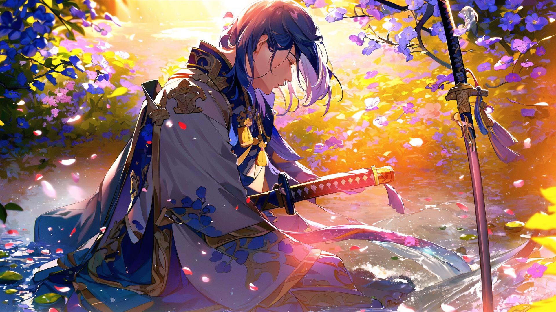1boy, blue hair, branch, cape, closed eyes, closed mouth, day, floral print, flower, from side, gold trim, hair over shoulder, japanese clothes, katana, long hair, long sleeves, looking down, male focus, outdoors, petals, petals on liquid , pink flower, profile, ripples, sheath, sheathed, sitting, solo, sunlight, sword, tassel, tree, water, weapon, wide sleeves