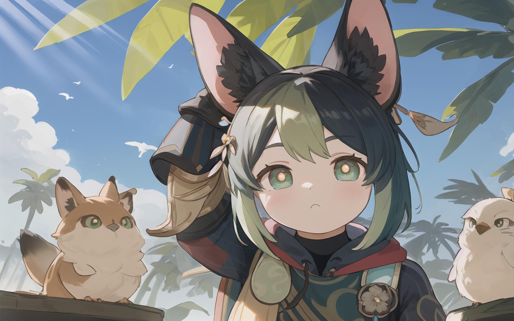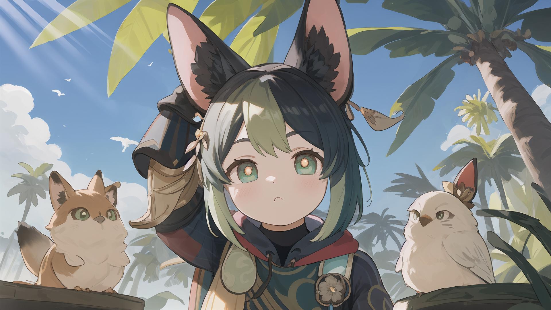 | Prompt | <lora:tighnari:0.8>tighnari (genshin impact), 1boy, animal ears, male focus, multicolored hair, yellow flower, medal, fox ears, black hair, green hair, green eyes, gloves, bird, flower, animal ear fluff, solo, blunt ends, vision (genshin impact), asymmetrical sleeves, fox boy, tassel,