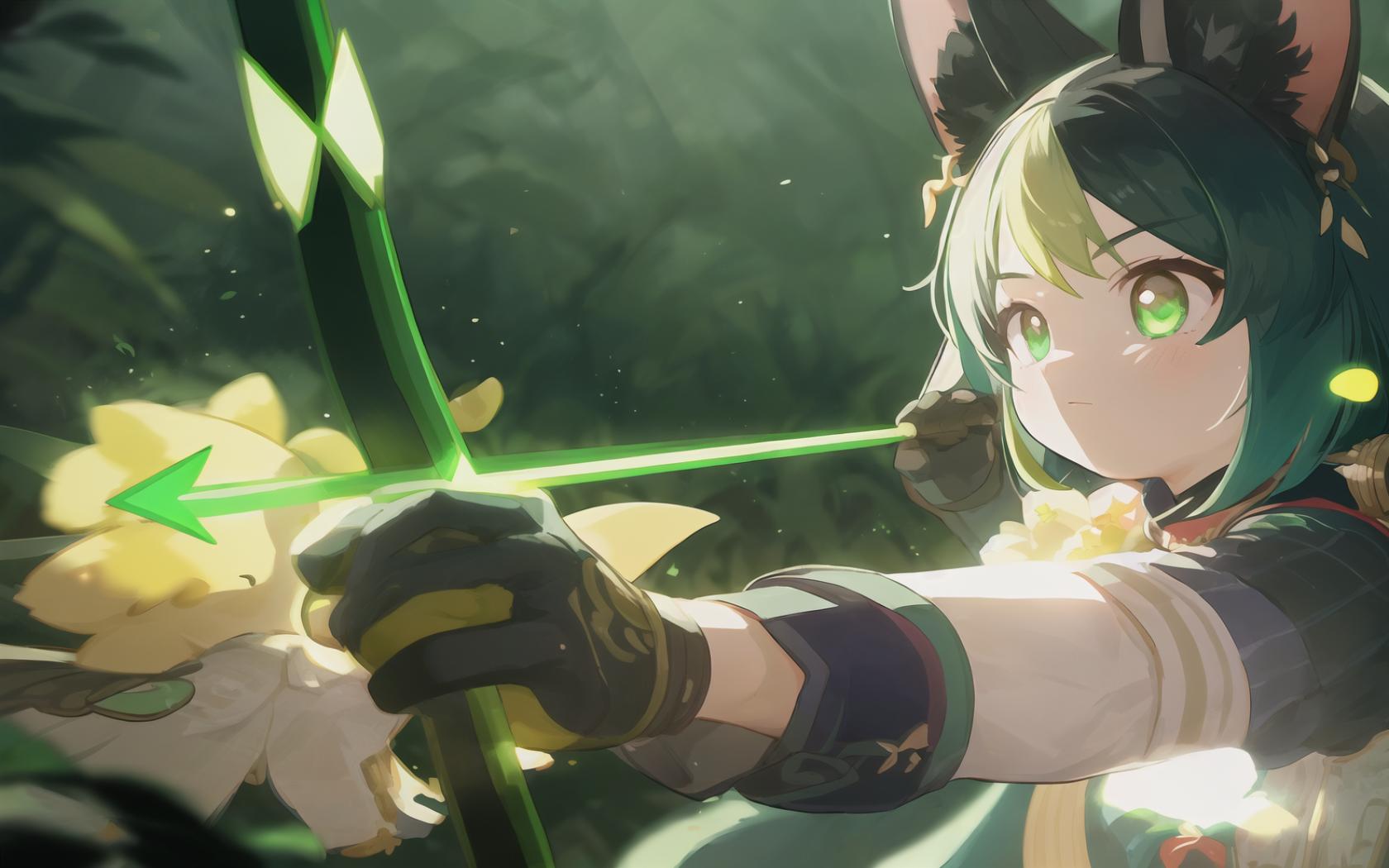 1boy, aiming, animal ear fluff, animal ears, arrow (projectile), asymmetrical sleeves, bangs, black gloves, black hair, blunt ends, bow (weapon), closed mouth, earrings, flower, forest, fox boy , fox ears, gloves, green eyes, green hair, holding, holding bow (weapon), holding weapon, jewelry, leaf, long sleeves, male focus, multicolored hair, nature, outdoors, short hair, single earring, solo, streaked hair, upper body, weapon, yellow flower