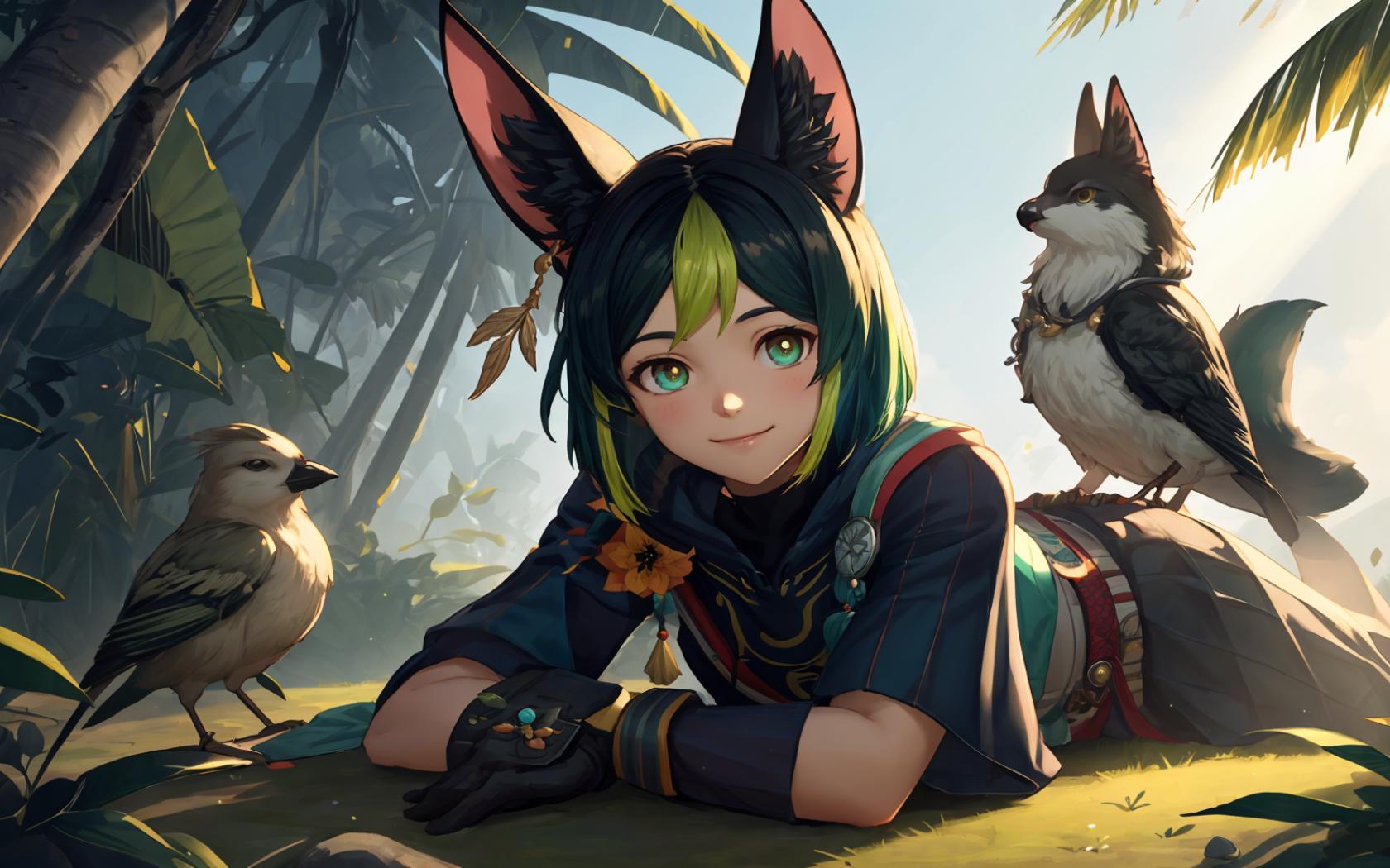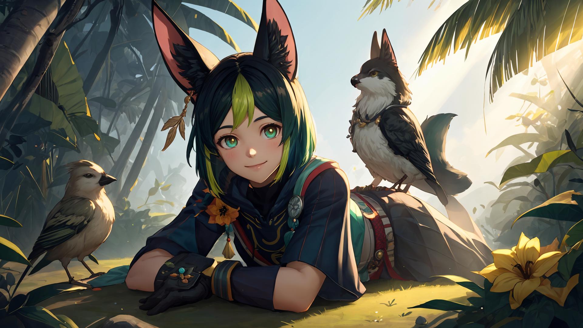 | Prompt | <lora:tighnari:0.8>tighnari (genshin impact), 1boy, animal ears, male focus, multicolored hair, yellow flower, medal, fox ears, black hair, green hair, green eyes, gloves, bird, flower, animal ear fluff, solo, blunt ends, vision (genshin impact), asymmetrical sleeves, fox boy, tassel,
