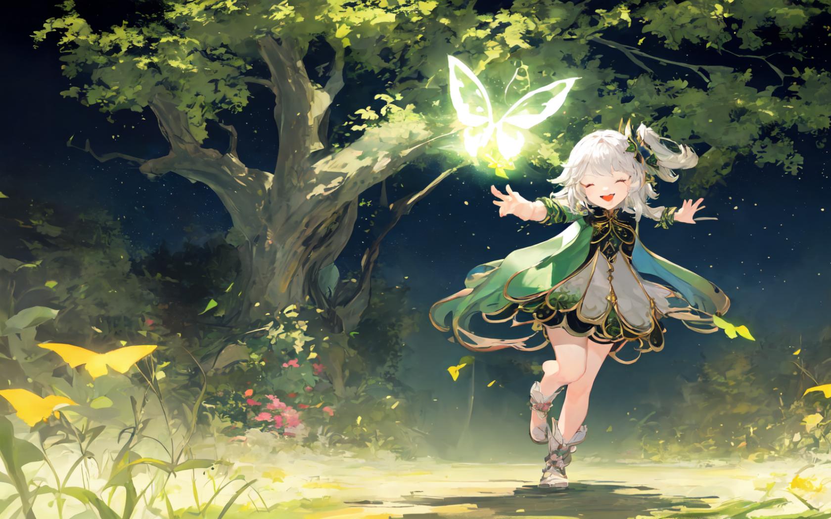 (running after a glowing green butterfly, jungle, white oriental tower far away),