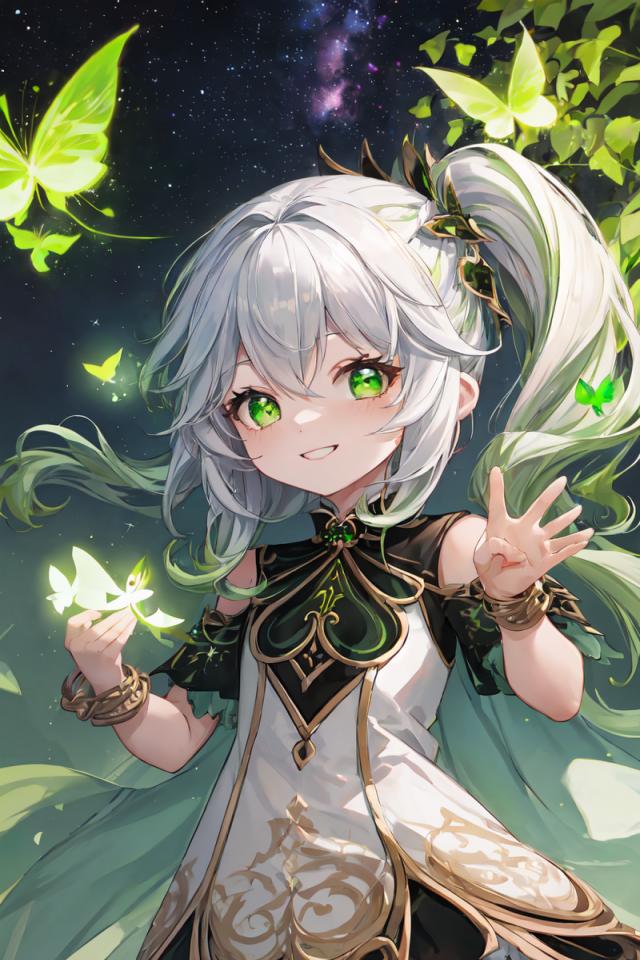 1girl, bangs, blush, bracelet, bug, butterfly, cape, cowboy shot, cross-shaped pupils, detached sleeves, dress, gold trim, gradient hair, green cape, green eyes, green gemstone , green hair, grin, hair between eyes, hair ornament, hands up, jewelry, leaf hair ornament, long hair, looking at viewer, multicolored hair, parted lips, pointy ears, short sleeves, side ponytail, sidelocks, sleeveless, sleeveless dress, smile, solo, symbol-shaped pupils, white dress, white hair