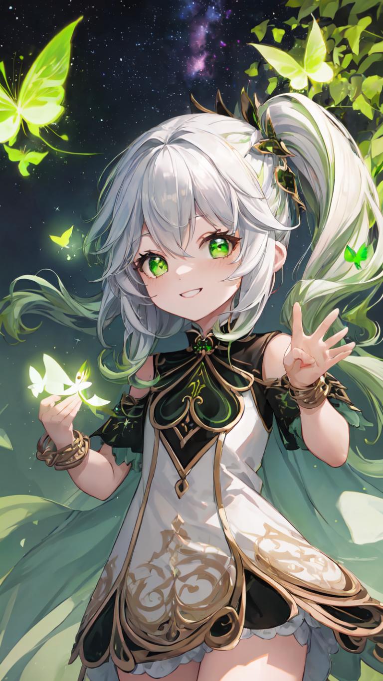 (running after a glowing green butterfly, jungle, white oriental tower far away),