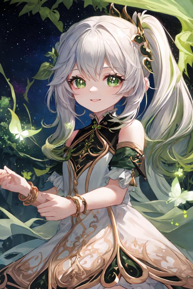 1girl, bangs, bare shoulders, bloomers, bracelet, bug, butterfly, cowboy shot, cross-shaped pupils , detached sleeves, dress, gold trim, gradient hair, green eyes, green hair, grin, hair between eyes, hair ornament, jewelry, leaf hair ornament, long hair, looking at viewer, multicolored hair, parted lips, pointy ears, short sleeves, side ponytail, sidelocks, sleeveless, sleeveless dress, smile, solo, symbol-shaped pupils, white bloomers, white dress, white hair