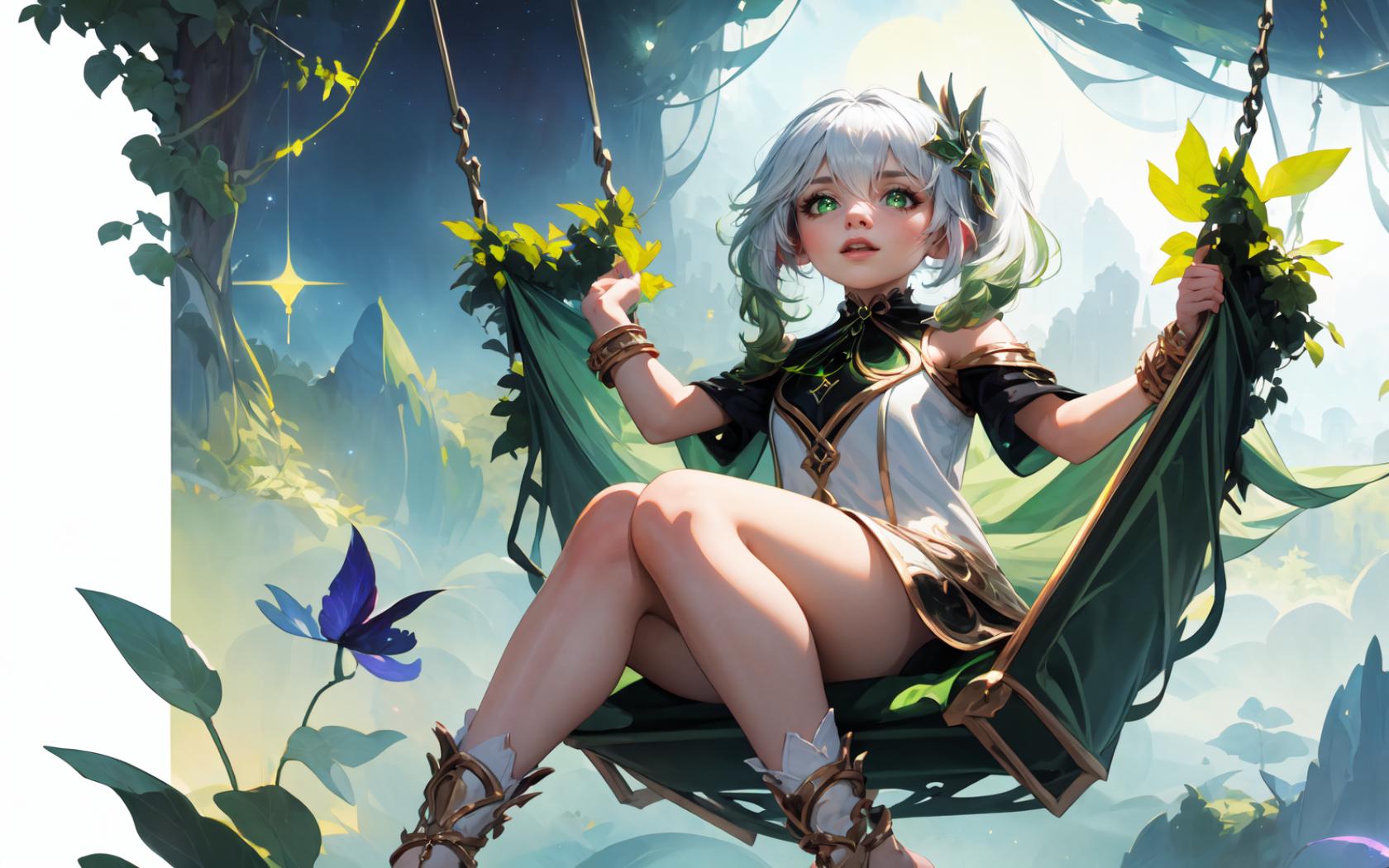 ((on a glowing green magical swing made of magical vines above white oriental town inside jungle far away below,high above the clouds, floating in the starry sky)),