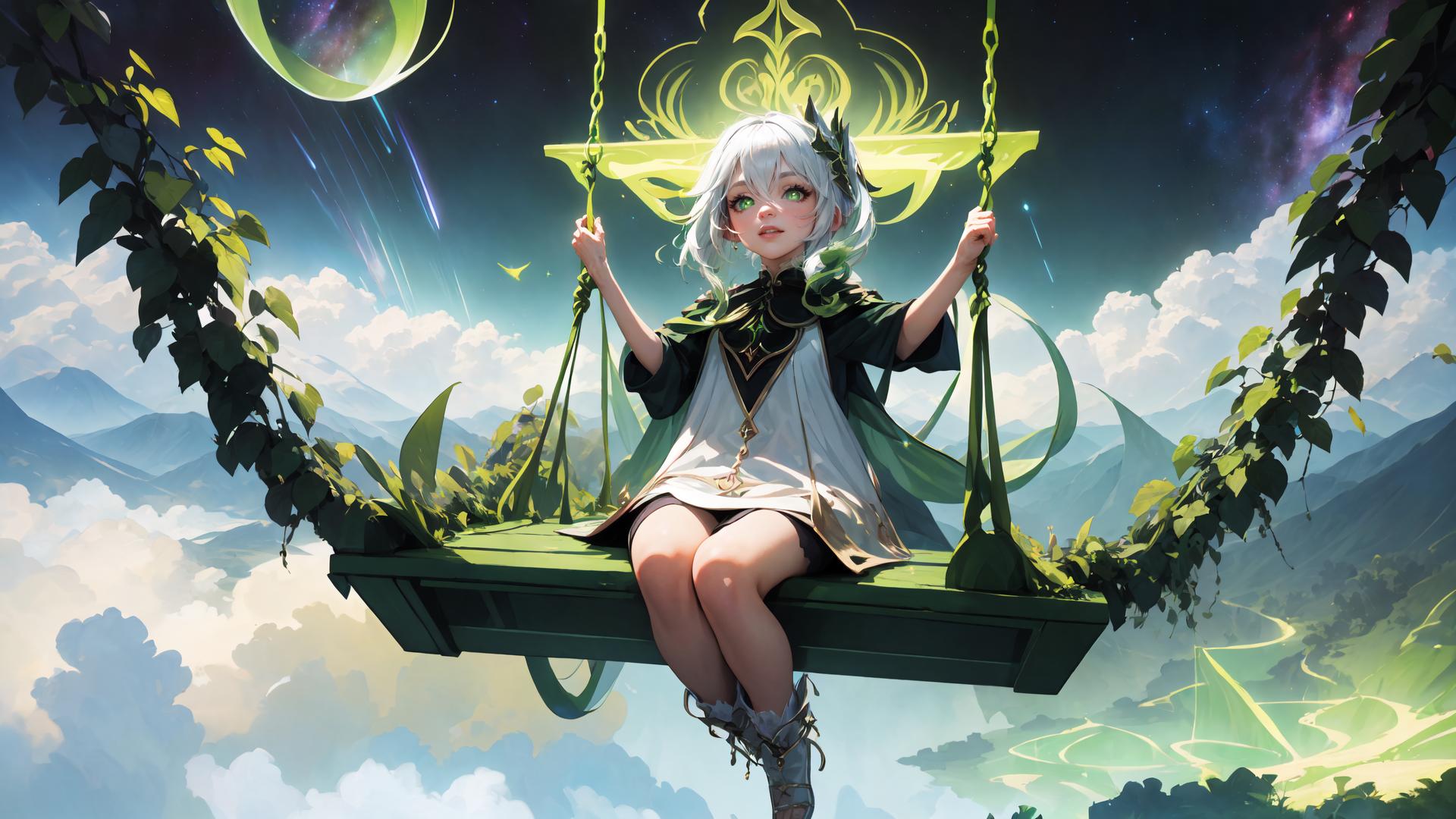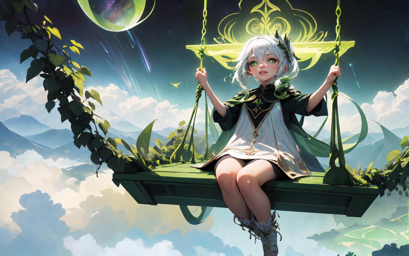 ((on a glowing green magical swing made of magical vines above white oriental town inside jungle far away below,high above the clouds, floating in the starry sky)),