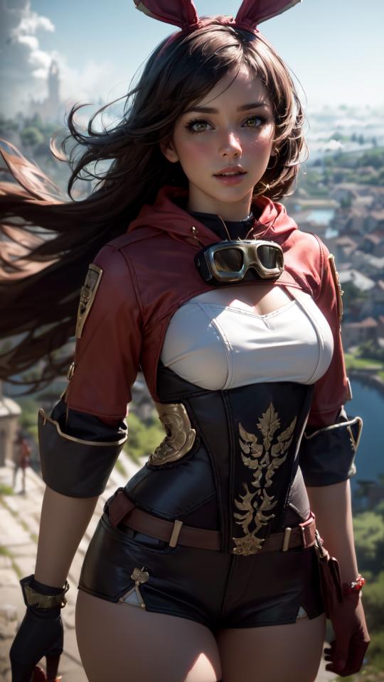 1girl, animal ears, belt, blurry, blurry background, brown eyes, brown hair, cleavage, cowboy shot, day, fake animal ears, gloves, goggles, goggles around neck , hairband, hood, long hair, looking at viewer, medium breasts, outdoors, parted lips, rabbit ears, realistic, ribbon, short shorts, shorts, smile, solo, standing, thighhighs