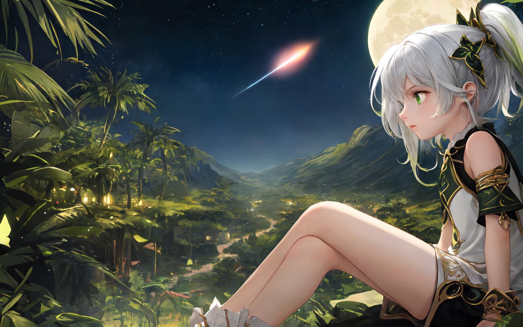 (galaxy background, glowing green lights of nebula, moon rays,meteor swarm, meteor shower),
