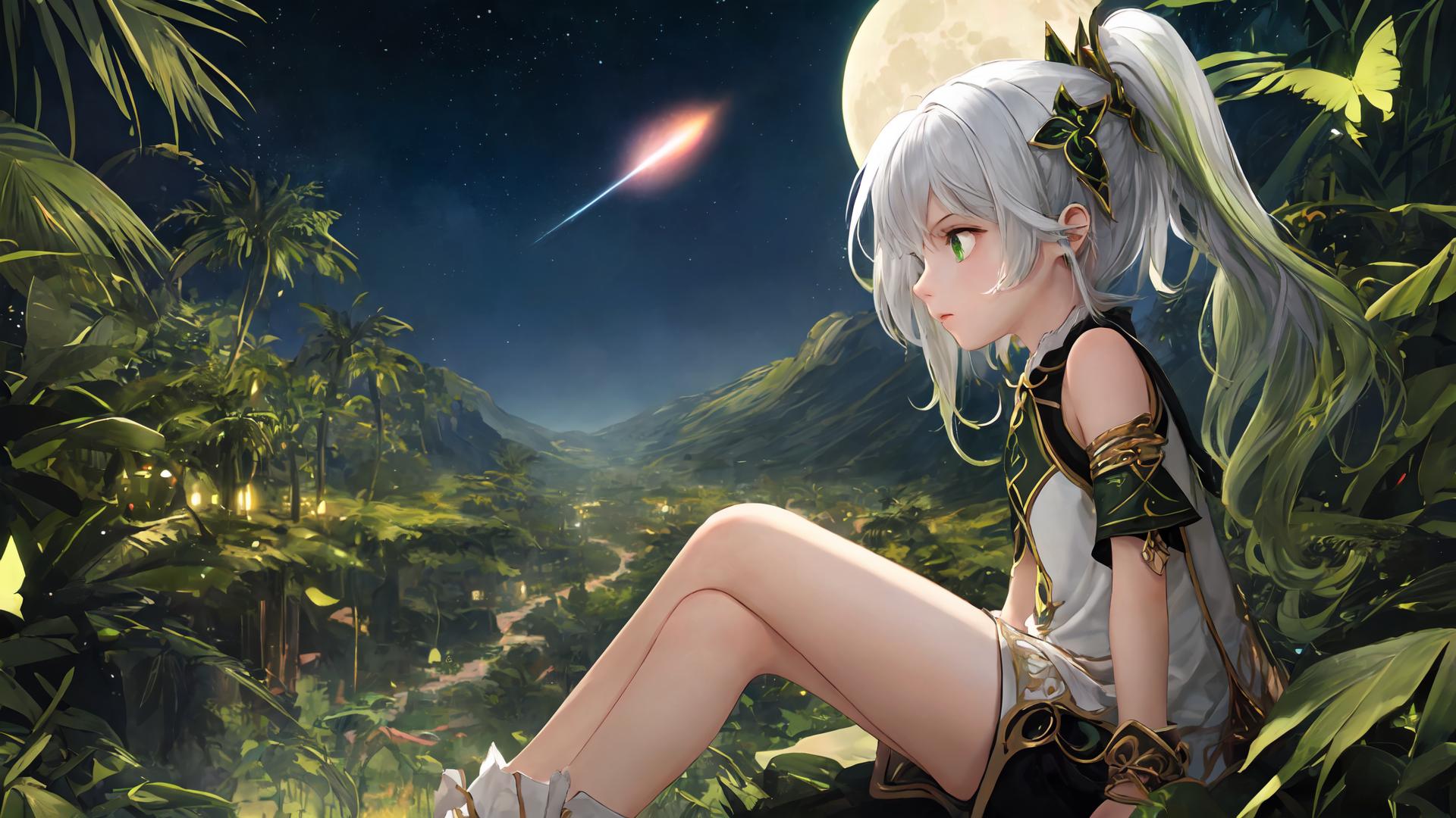 1girl, bangs, bare shoulders, bracelet, bug, butterfly, detached sleeves, dress, feet out of frame, from side, full moon, gradient hair, green eyes, green hair, hair ornament, jewelry, knees up, legs, long hair, looking away, moon, multicolored hair, night, night sky, outdoors, parted lips, plant, pointy ears, ponytail, profile, short sleeves, side ponytail, sidelocks, sitting, sky, sleeveless, sleeveless dress, solo, star (sky), starry sky , symbol-shaped pupils, tree, white dress, white hair, white socks