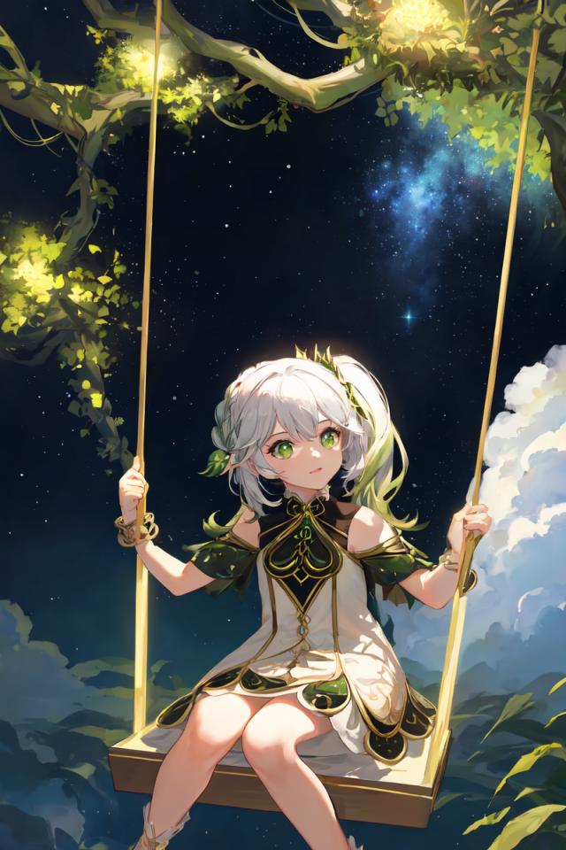 Prompt <lora:nahida1:1>((nahidadef)), ((on a glowing green magical swing made of magical vines above white oriental town inside jungle far away below,high above the clouds, floating in the starry sky)), (((night,green nebula,galaxy background))), ((childish)), happy, , glowing green lights,