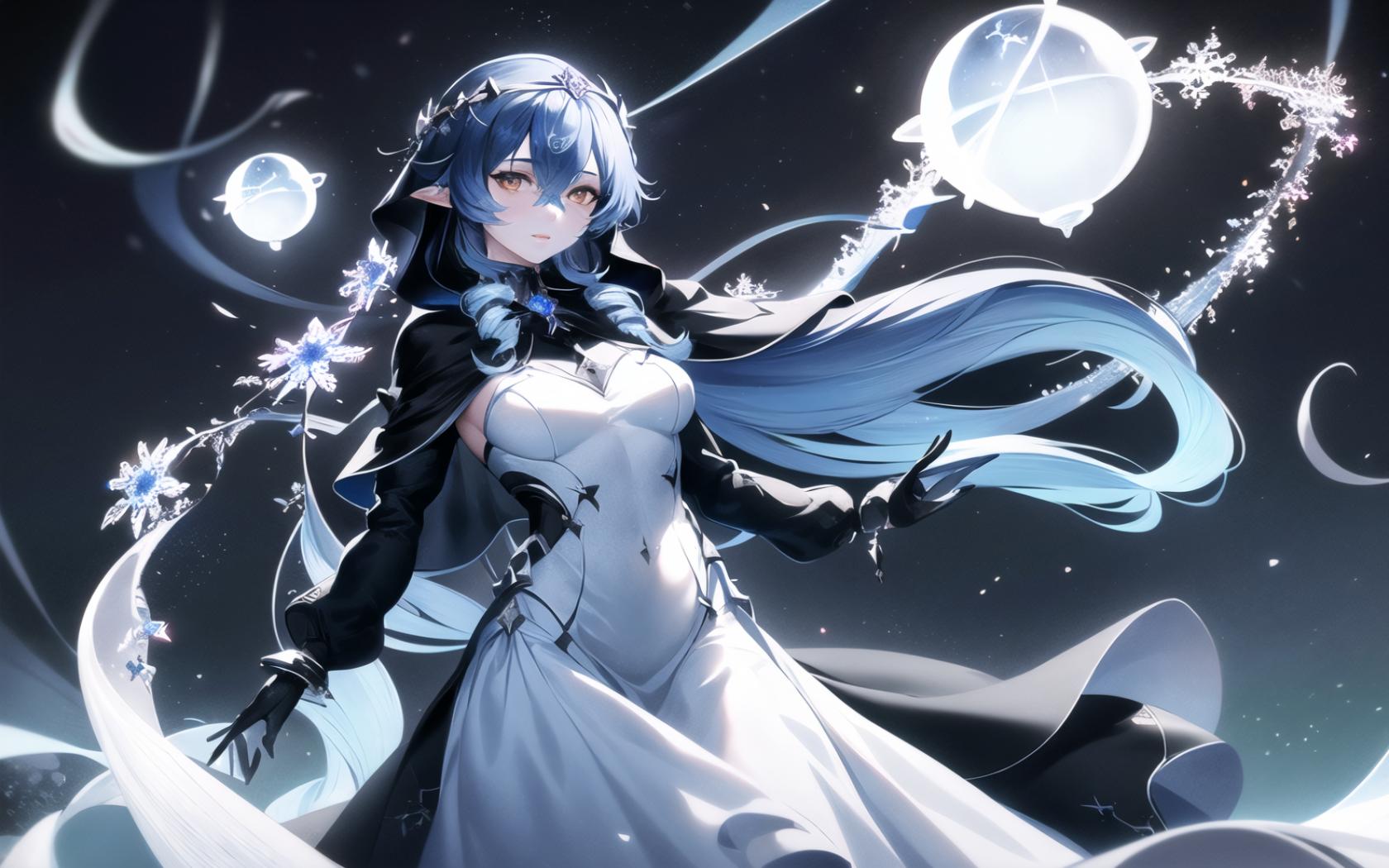 | Prompt | (epic:1.1, perfect artwork), best quality,dynamic pose,sharp focus,(8k), (4k),(Masterpiece), (Best Quality), fantasy, extremely detailed, intricate, hyper detailed, (perfect face), illustration, Ultra detailed fantasy environment, clearly worked out detail, intricate, cinematic,(depth of field), (realistic:1.5),photorealistic, octane render,(hyperrealistic:1.2),(skindentation:1.3),(photorealistic face:1.2),(1girl:1.4),(skindentation:1.3),best quality,dynamic pose,sharp focus,(8k), (4k),(Masterpiece), (Best Quality), fantasy, extremely detailed, intricate, hyper detailed, (perfect face), illustration,soft lighting,(specular lighting:1.4), <lora:layla1:0.8>, laylarnd, 1girl, long hair, blue hair, cleavage, wind, night, moonlit,snow, snowflakes, (snow on trees), winter, (aurora borealis), walking to viewer, inside a garden courtyard, (Standing upright:1.2), white flowers, (long black lace dress:1.5), black stockings, black chestlace, (black silk cape:1.5), black leather boots, galaxy background, light smile, looking at viewer, sexy, (full body), |