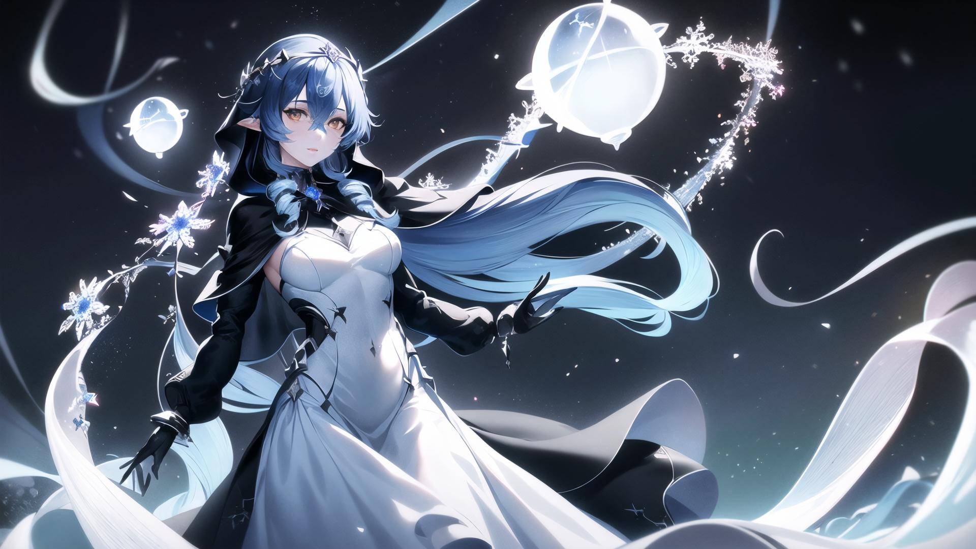 1girl, bangs, black background, black dress, black gloves, blue hair, bright pupils, capelet, covered navel, detached sleeves, dress, drill hair, drill locks , floating hair, flower, gloves, hair between eyes, hood, hood up, jewelry, long hair, long sleeves, looking at viewer, medium breasts, parted lips, pointy ears, puffy long sleeves, puffy sleeves, sidelocks, solo, very long hair, white dress, white pupils, yellow eyes
