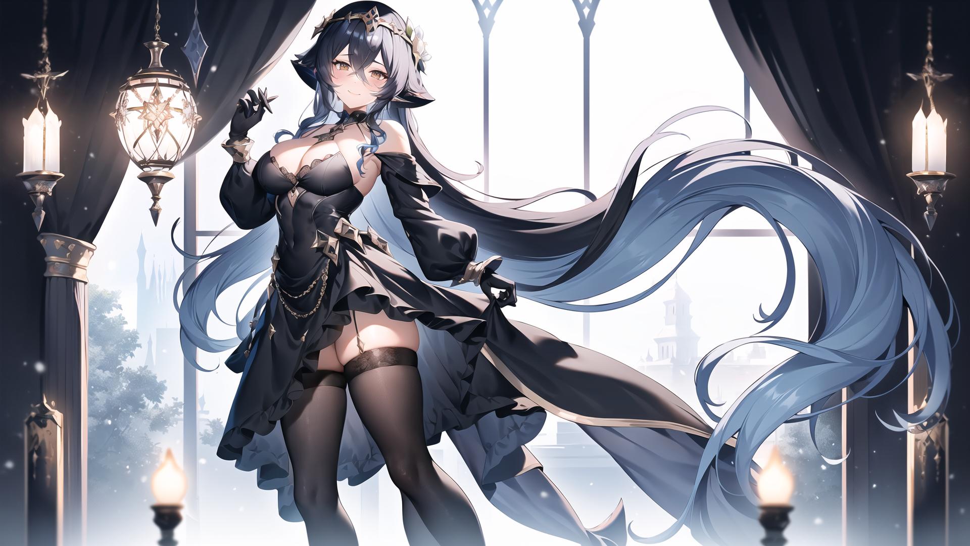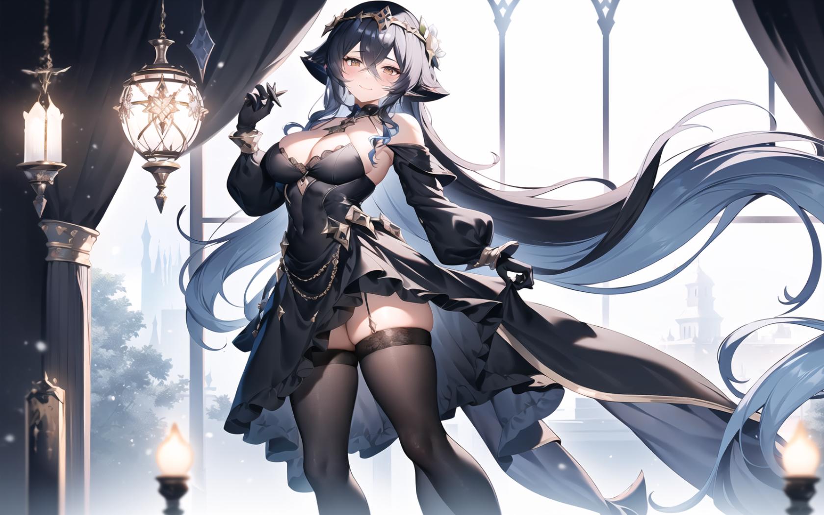 | Prompt | (epic:1.1, perfect artwork), best quality,dynamic pose,sharp focus,(8k), (4k),(Masterpiece), (Best Quality), fantasy, extremely detailed, intricate, hyper detailed, (perfect face), illustration, Ultra detailed fantasy environment, clearly worked out detail, intricate, cinematic,(depth of field), (black ornate silk dress:1.4), (black stockings:1.3, black chestlace:1.3), (black silk cape:1.3), (black leather boots, holding a snowy white flower, black hat ornated with white flower:1.3), (romantic:1.5, heroic:1.5), night, moonlit,snow, snowflakes, (snow on trees), winter, (aurora borealis:1.2), (snowflakes), walking to viewer, (snowy garden courtyard background:1.2), (Standing upright:1.2), white flowers, frozen ice orbs, blush, smile, looking at viewer, sexy, (full body:1.2), <lora:layla1:0.6>, laylarnd, 1girl, long hair, blue hair, cleavage, wind, |