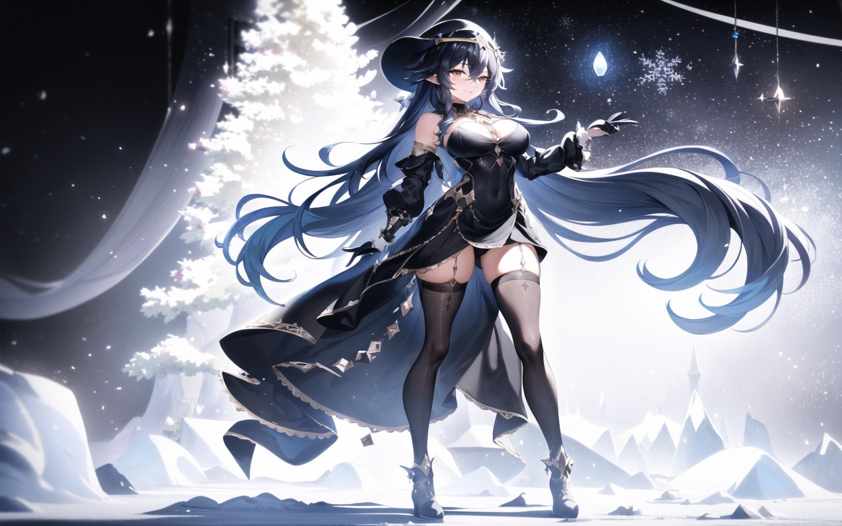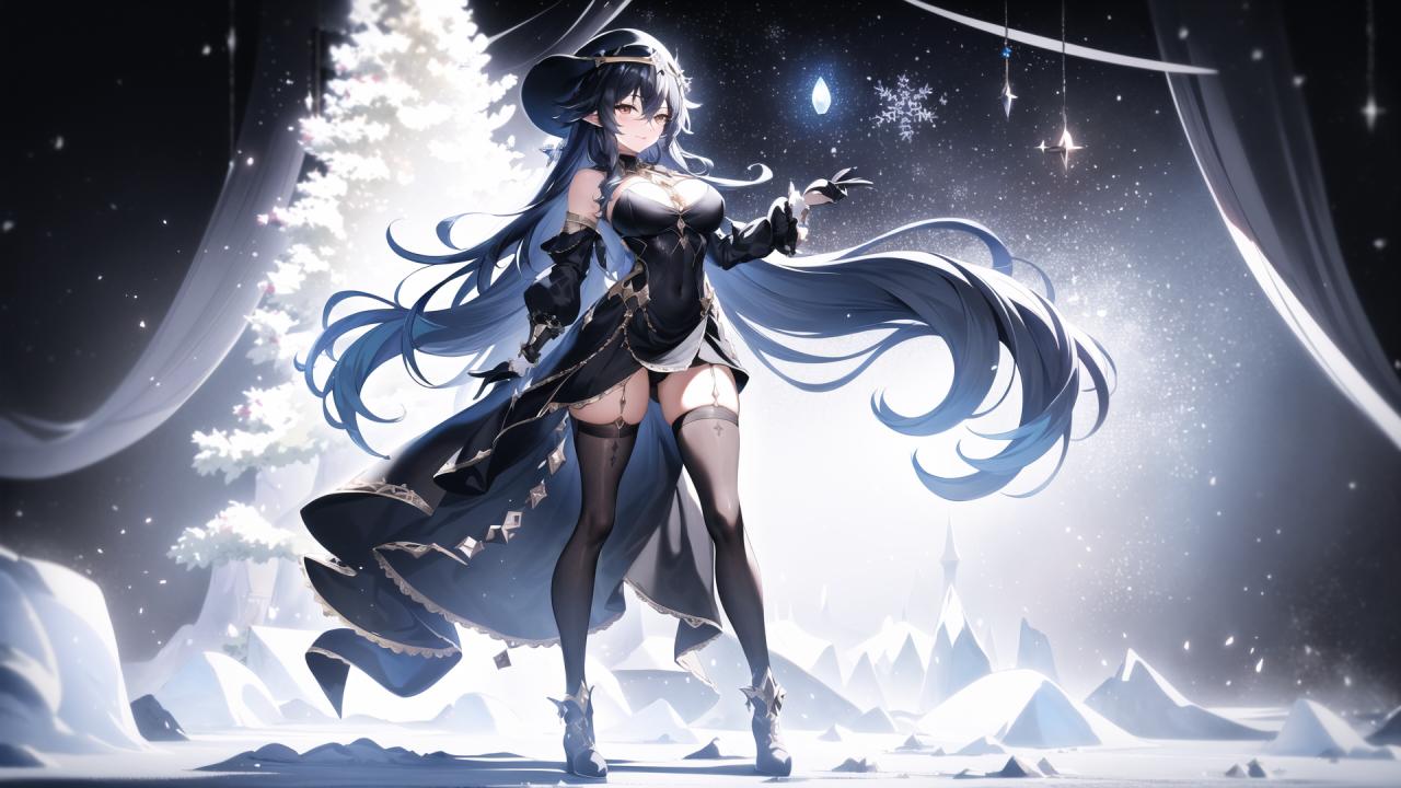 Prompt (epic:1.1, perfect artwork), best quality,dynamic pose,sharp focus,(8k), (4k),(Masterpiece), (Best Quality), fantasy, extremely detailed, intricate, hyper detailed, (perfect face), illustration, Ultra detailed fantasy environment, clearly worked out detail, intricate, cinematic,(depth of field), (black ornate silk dress:1.4), (black stockings:1.3, black chestlace:1.3), (black silk cape:1.3), (black leather boots, holding a snowy white flower, black hat ornated with white flower:1.3), (romantic:1.5, heroic:1.5), night, moonlit,snow, snowflakes, (snow on trees), winter, (aurora borealis:1.2), (snowflakes), walking to viewer, (snowy garden courtyard background:1.2), (Standing upright:1.4), white flowers, frozen ice orbs, blush, smile, looking at viewer, sexy, (full body:1.2), (heroic pose:1.3), <lora:layla1:0.6>, laylarnd, 1girl, long hair, blue hair, cleavage, wind,