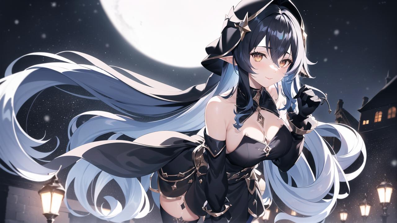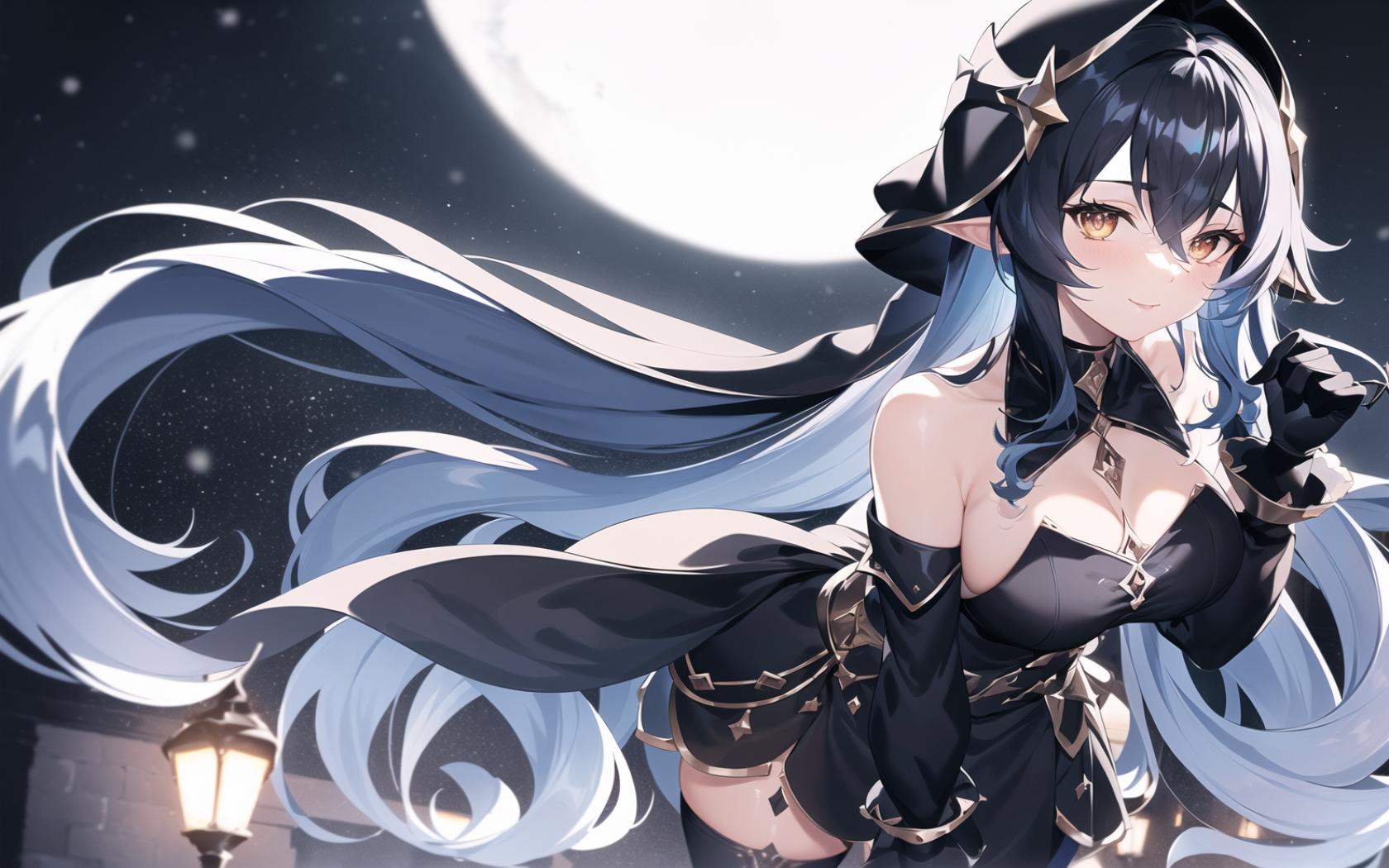 Prompt (epic:1.1, perfect artwork), best quality,dynamic pose,sharp focus,(8k), (4k),(Masterpiece), (Best Quality), fantasy, extremely detailed, intricate, hyper detailed, (perfect face), illustration, Ultra detailed fantasy environment, clearly worked out detail, intricate, cinematic,(depth of field), (black ornate silk dress:1.4), (black stockings:1.3, black chestlace:1.3), (black silk cape:1.3), (black leather boots, holding a snowy white flower, black hat ornated with white flower:1.3), (romantic:1.5, heroic:1.5), night, moonlit,snow, snowflakes, (snow on trees), winter, (aurora borealis:1.2), (snowflakes), walking to viewer, (snowy garden courtyard background:1.2), (Standing upright:1.4), white flowers, frozen ice orbs, blush, smile, looking at viewer, sexy, (full body:1.2), (heroic pose:1.3), <lora:layla1:0.6>, laylarnd, 1girl, long hair, blue hair, cleavage, wind,
