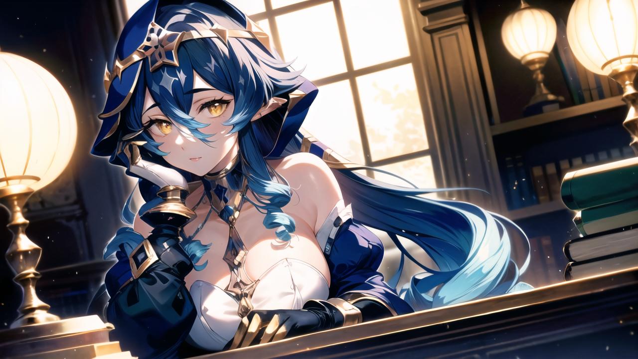 | Prompt | <lora:beautiful-eyes:0.6> (epic:1.5, perfect artwork), best quality,dynamic pose,sharp focus,(8k), (4k),(Masterpiece), (Best Quality), fantasy, extremely detailed, intricate, hyper detailed, (perfect face), illustration,soft lighting,(specular lighting:1.4), Ultra detailed fantasy environment, clearly worked out detail, intricate, cinematic,(depth of field), <lora:layla1:1>, layladef, night, moonlit, inside a rich library, plants, bookshells, white marble, stuying at desk, open books, looking at viewer, light smile, sexy, |