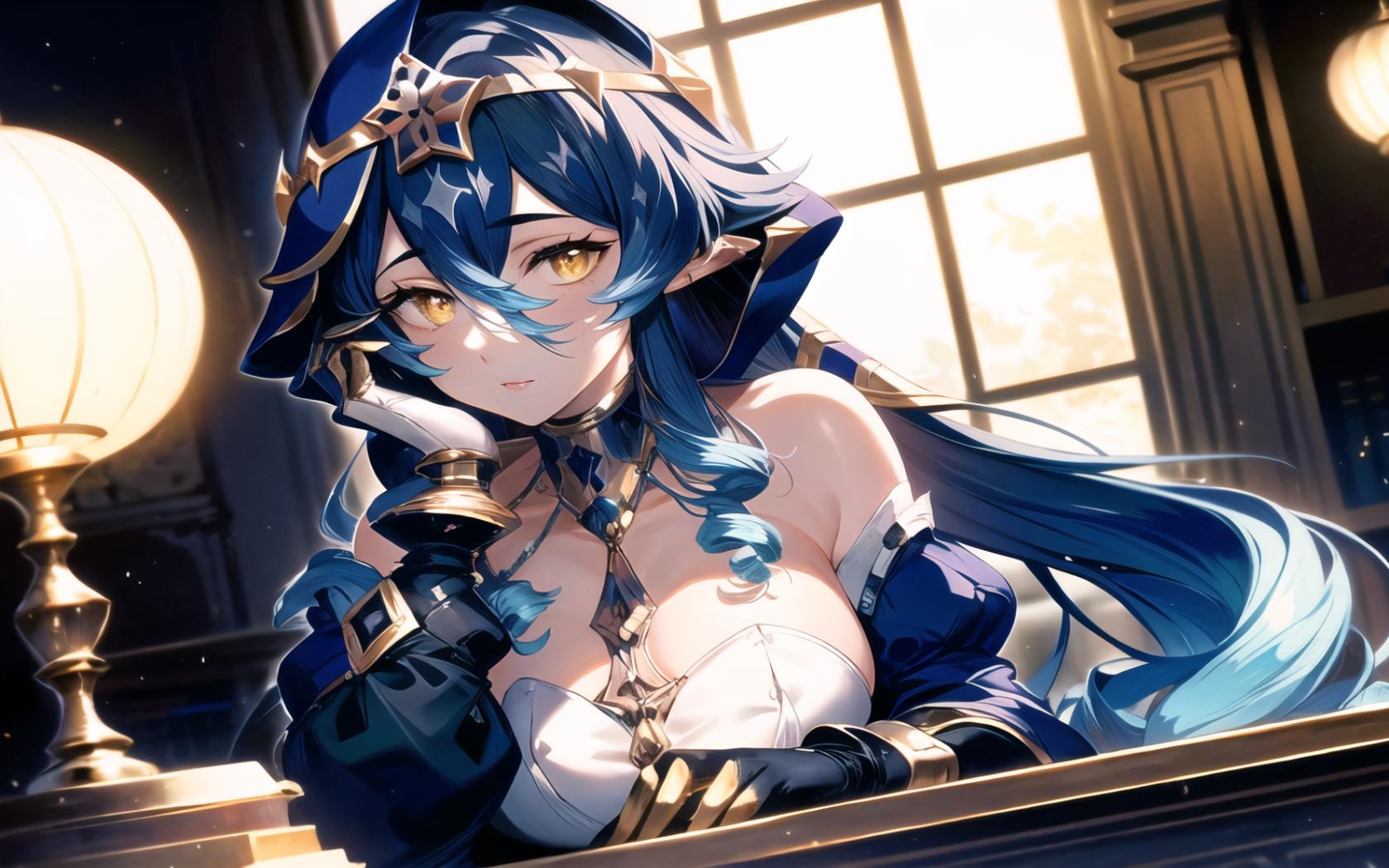 1girl, bangs, bare shoulders, black gloves, blue hair, blue sleeves, book, book stack, bright pupils, claw ring , cleavage, closed mouth, detached sleeves, drill hair, drill locks, gloves, hair between eyes, head rest, hood, hood up, indoors, jewelry, juliet sleeves, lamp, lantern, large breasts, long hair, long sleeves, looking at viewer, neck ring, pointy ears, puffy long sleeves, puffy sleeves, sidelocks, solo, twin drills, upper body, very long hair, white pupils, window, yellow eyes