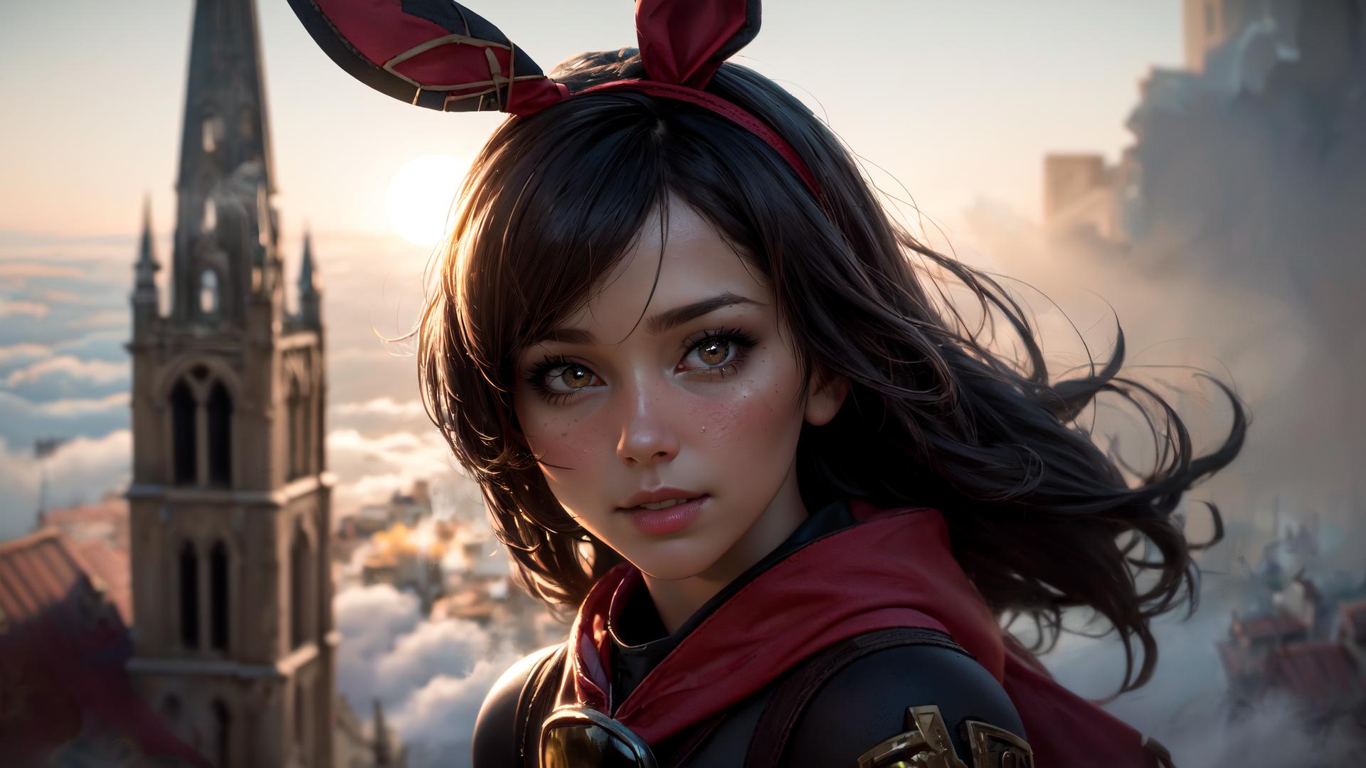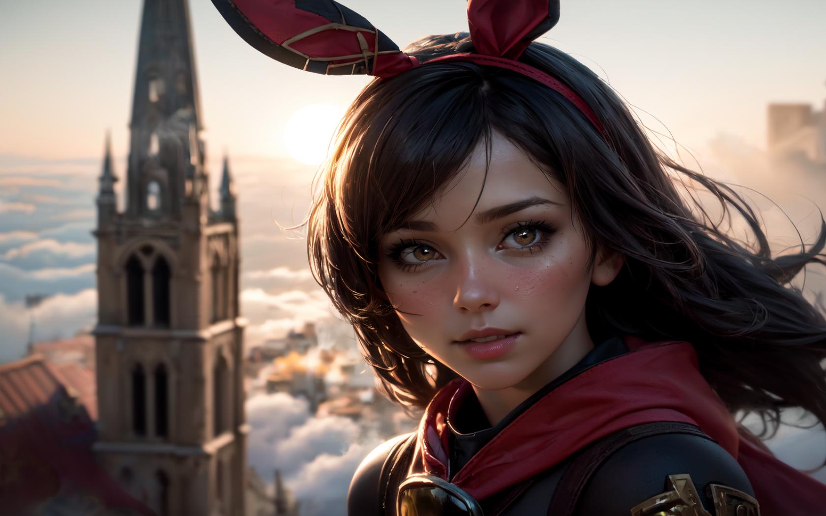 1girl, animal ears, backlighting, bangs, black hair, blurry, blurry background, brown eyes, brown hair, castle, cloud, day, depth of field, eyelashes, fake animal ears, freckles, hairband, long hair, looking at viewer, mole, outdoors, parted lips, portrait, rabbit ears, realistic, red hairband, red scarf, scarf, sky, solo, swept bangs, tower