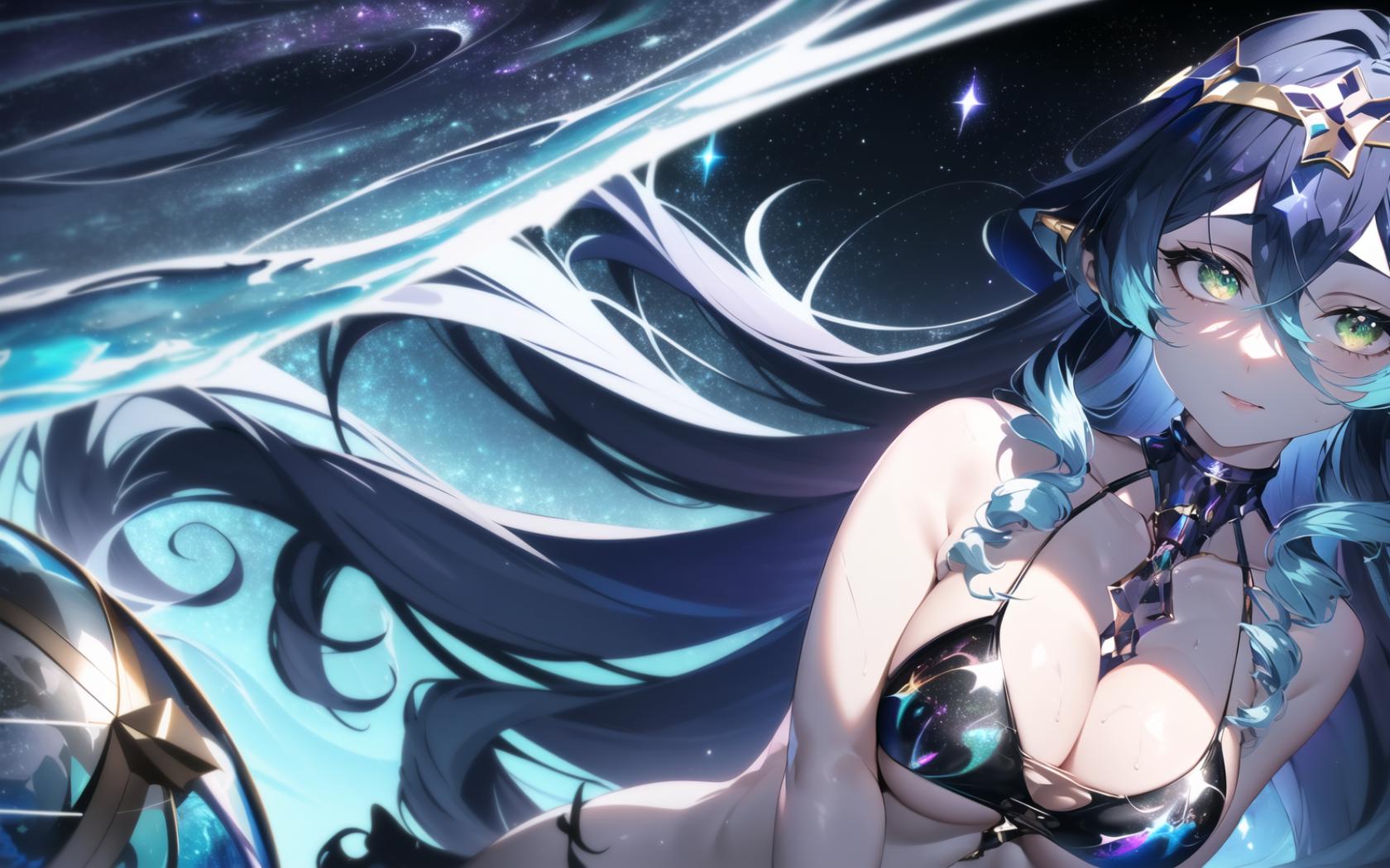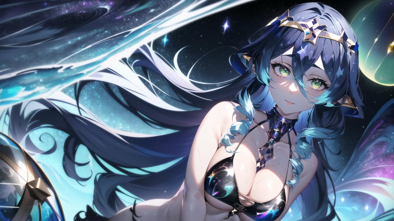 | Prompt | <lora:beautiful-eyes:0.6> (epic:1.5, perfect artwork), (highly detailed:1.6), best quality,dynamic pose,sharp focus,(8k), (4k),(Masterpiece), (Best Quality), fantasy, extremely detailed, intricate, hyper detailed, (perfect face), illustration, Ultra detailed fantasy environment, clearly worked out detail, intricate, cinematic,(depth of field), (romantic:1.4), (heroic:1.2), (dark atmosphere:1.8, dark fantasy art:1.5, digital art:1.3), (dramatic lighting:1.5),photorealistic, octane render,(hyperrealistic:1.2),(skindentation:1.3),(photorealistic face:1.2),(1girl:1.4), <lora:layla1:1.0>, laylarnd, 1girl, very long hair,medium breast, (galaxy printed bikini made of aurora borealis:1.5), wind, bare arms, bare legs, bare hands, (night, black sky, galaxy background:1.2), stars, black hole, nebula, (floating magical ice orbs:1.2), aurora borealis, (walking in nebula water made of aurora borealis:1.4), blush, smile, happy, surprised, wet, (looking at viewer), sexy, |