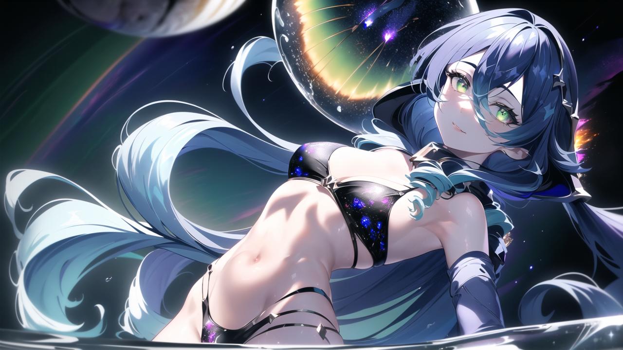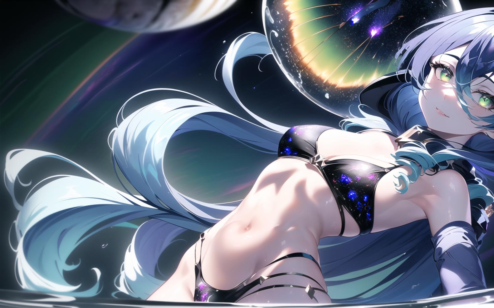 Prompt <lora:beautiful-eyes:0.6> (epic:1.5, perfect artwork), (highly detailed:1.6), best quality,dynamic pose,sharp focus,(8k), (4k),(Masterpiece), (Best Quality), fantasy, extremely detailed, intricate, hyper detailed, (perfect face), illustration, Ultra detailed fantasy environment, clearly worked out detail, intricate, cinematic,(depth of field), (romantic:1.4), (heroic:1.2), (dark atmosphere:1.8, dark fantasy art:1.5, digital art:1.3), (dramatic lighting:1.5),photorealistic, octane render,(hyperrealistic:1.2),(skindentation:1.3),(photorealistic face:1.2),(1girl:1.4), <lora:layla1:1.0>, laylarnd, 1girl, very long hair,medium breast, (galaxy printed bikini made of aurora borealis:1.5), wind, bare arms, bare legs, bare hands, (night, black sky, galaxy background:1.2), stars, black hole, nebula, (floating magical ice orbs:1.2), aurora borealis, (walking in nebula water made of aurora borealis:1.4), blush, smile, happy, surprised, wet, (looking at viewer), sexy,