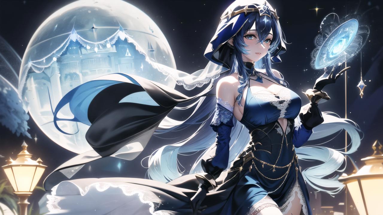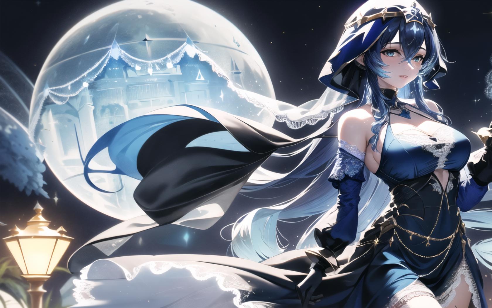 Prompt (realistic:1.5),photorealistic, octane render,(hyperrealistic:1.2),(skindentation:1.3),(photorealistic face:1.2),(1girl:1.4), (epic:1.1, perfect artwork), best quality,dynamic pose,sharp focus,(8k), (4k),(Masterpiece), (Best Quality), fantasy, extremely detailed, intricate, hyper detailed, (perfect face), illustration, Ultra detailed fantasy environment, clearly worked out detail, intricate, cinematic,(depth of field), <lora:layla1:>, laylarnd, 1girl, long hair, blue hair, cleavage, (solo:1.2), (wearing blue ceremonial lace dress:1.7),(white embroidery :0.95), black gloves, night, moonlit, aurora borealis, outdoors, outside, wind, galaxy background, (medieval garden courtyard background:1.2), white marble statues, flowers, coconut trees, (slowly walking to viewer :1.1),catwalk,(standing upright:1.3), (wearing a pile of books), blush, smile, happy, sexy, (looking at viewer),facing viewer, turned to viewer,