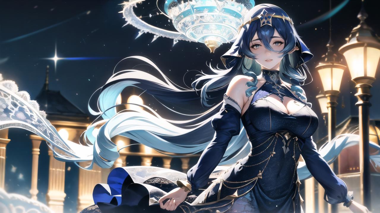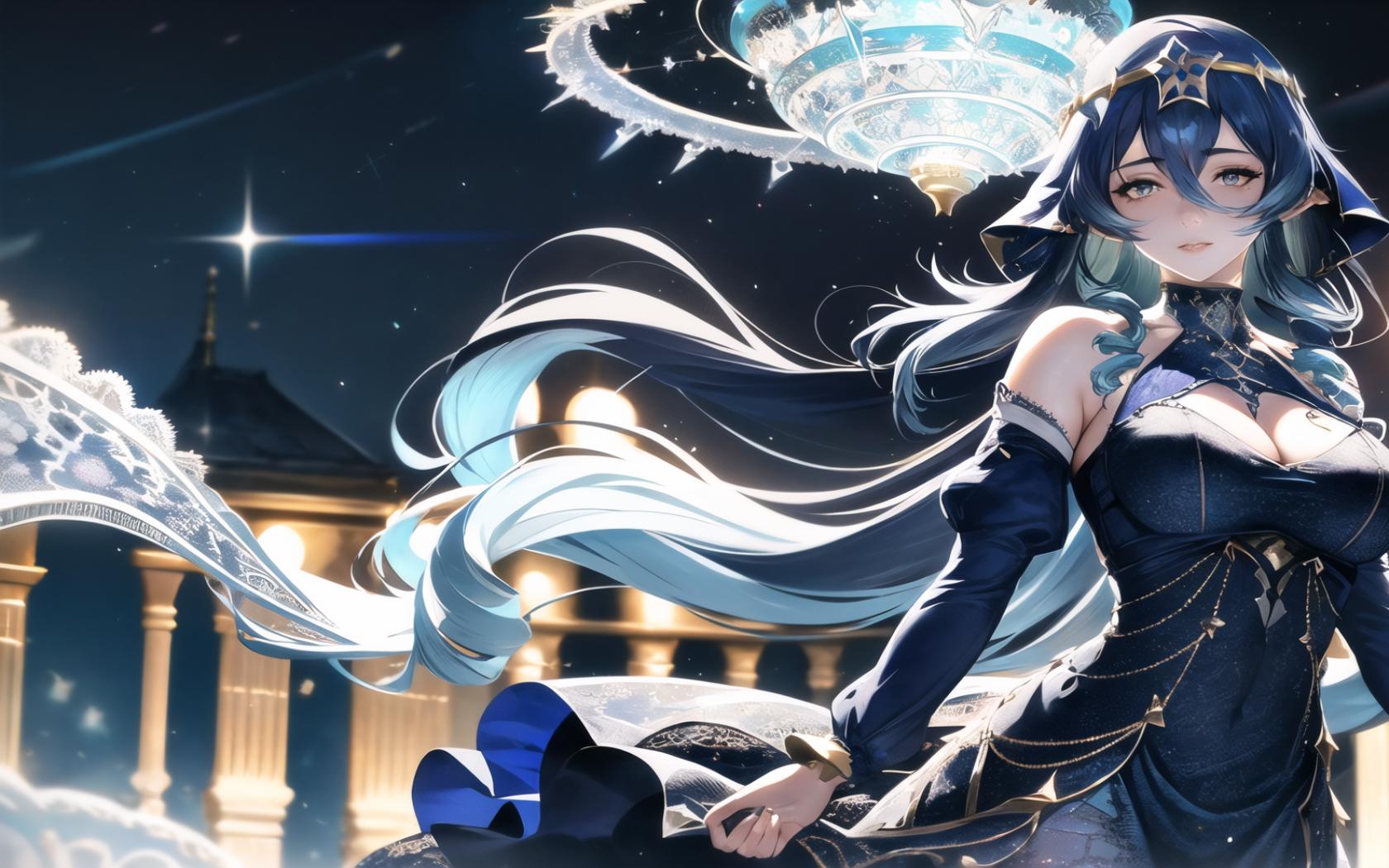 | Prompt | (realistic:1.5),photorealistic, octane render,(hyperrealistic:1.2),(skindentation:1.3),(photorealistic face:1.2),(1girl:1.4), (epic:1.1, perfect artwork), best quality,dynamic pose,sharp focus,(8k), (4k),(Masterpiece), (Best Quality), fantasy, extremely detailed, intricate, hyper detailed, (perfect face), illustration, Ultra detailed fantasy environment, clearly worked out detail, intricate, cinematic,(depth of field), <lora:layla1:>, laylarnd, 1girl, long hair, blue hair, cleavage, (solo:1.2), (wearing blue lace dress:1.7),(white embroidery :0.95), white gloves, night, moonlit, aurora borealis, outdoors, outside, wind, galaxy background, (medieval garden courtyard background:1.2), white marble statues, flowers, coconut trees, (slowly walking to viewer :1.1),catwalk,(standing upright:1.3), (holding a pile of books:1.1), blush, smile, happy, sexy, (looking at viewer),facing viewer, turned to viewer, |