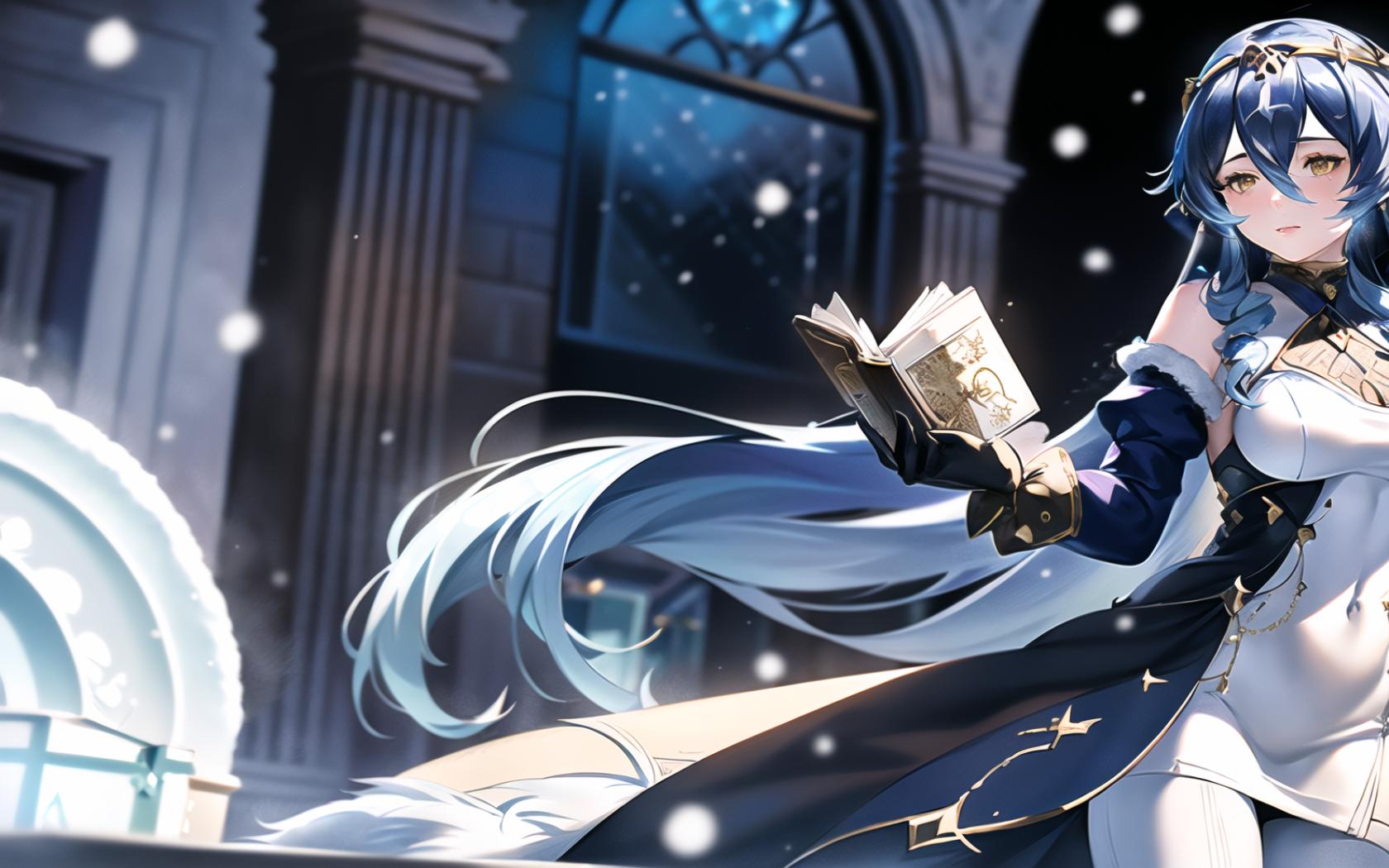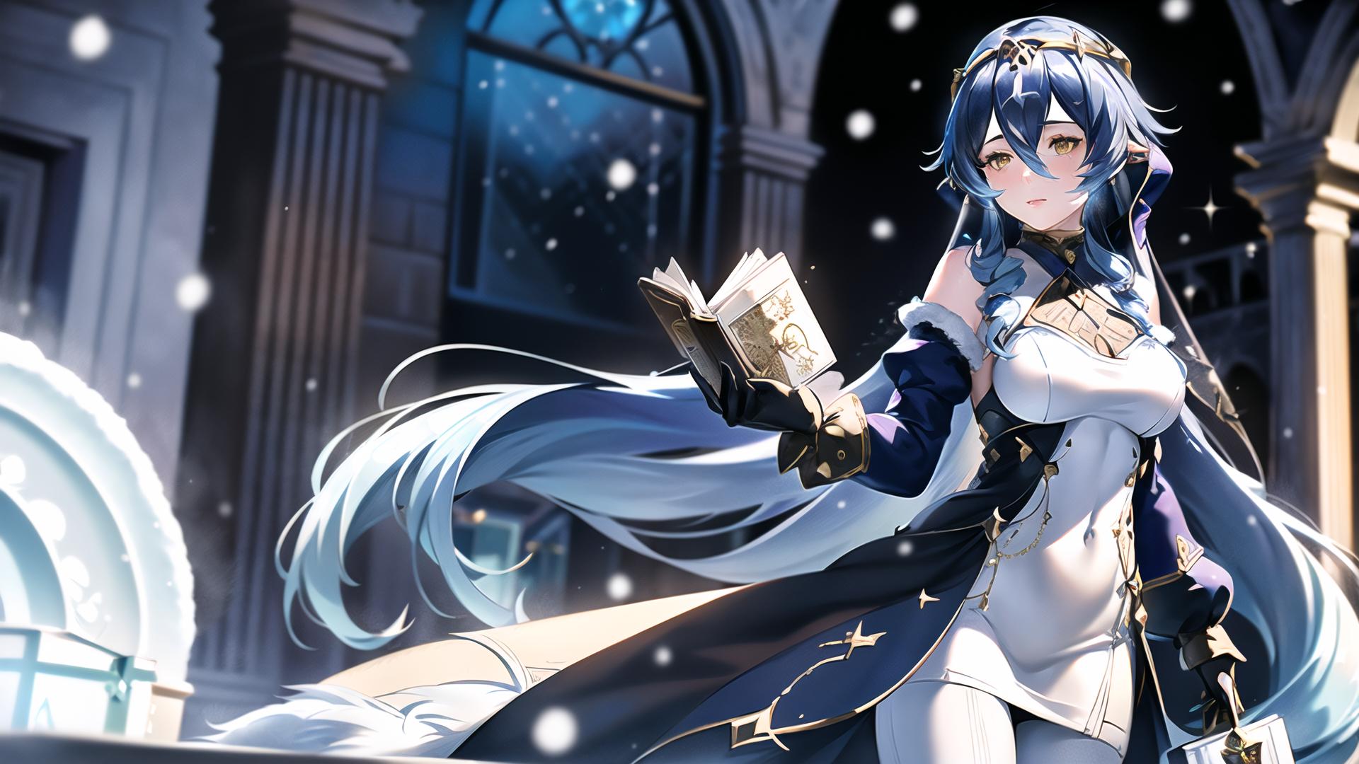 Prompt (realistic:1.5),photorealistic, octane render,(hyperrealistic:1.2),(skindentation:1.3),(photorealistic face:1.2),(1girl:1.4), (epic:1.1, perfect artwork), best quality,dynamic pose,sharp focus,(8k), (4k),(Masterpiece), (Best Quality), fantasy, extremely detailed, intricate, hyper detailed, (perfect face), illustration, Ultra detailed fantasy environment, clearly worked out detail, intricate, cinematic,(depth of field), <lora:layla1:0.8>, laylarnd, 1girl, long hair, blue hair, cleavage, (solo:1.9), winter, snowing, (wearing black gloves:1.2), (wearing black pantyhose:1.2), (wearing black boots:1.2),(wearing black lace dress:1.4),(golden embroidery :1.4), (white fur coat:1.7), night, moonlit, aurora borealis, outdoors, outside, wind, galaxy background, snow, (snow on trees:1.3), snowflakes, (medieval garden courtyard background:1.2), white marble statues, (snow on white flowers:1.2), cold, (slowly walking to viewer :1.1),catwalk,(standing upright:1.3), (holding a book:1.4), blush, smile, happy, sexy, (looking at book),facing viewer, turned to viewer,