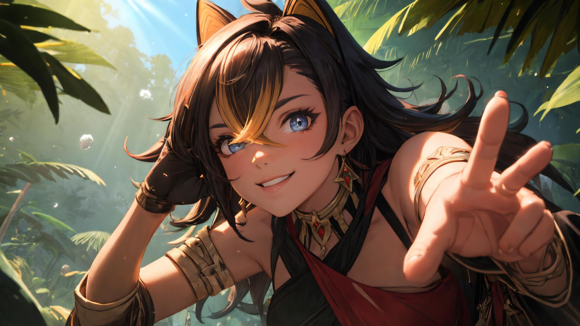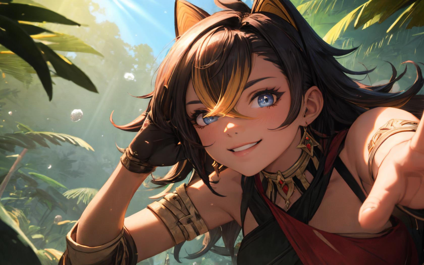1girl, animal ears, armlet, asymmetrical clothes, bangs, bare shoulders, black gloves, black hair, blonde hair, blue eyes, blue sky, criss-cross halter, crossed bangs, dangle earrings, dark skin, dark-skinned female, day, earrings, gem, gloves, grin, hair between eyes, hair ears , hair intakes, halterneck, jewelry, long hair, looking at viewer, multicolored hair, outdoors, palm tree, parted lips, red gemstone, sky, smile, solo, streaked hair, tree, upper body, v