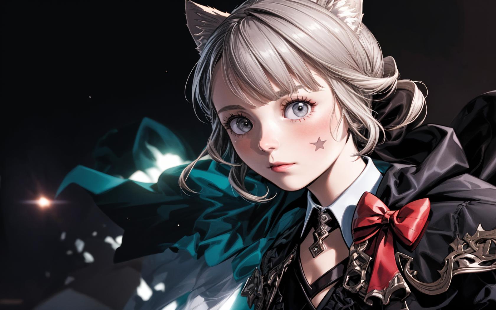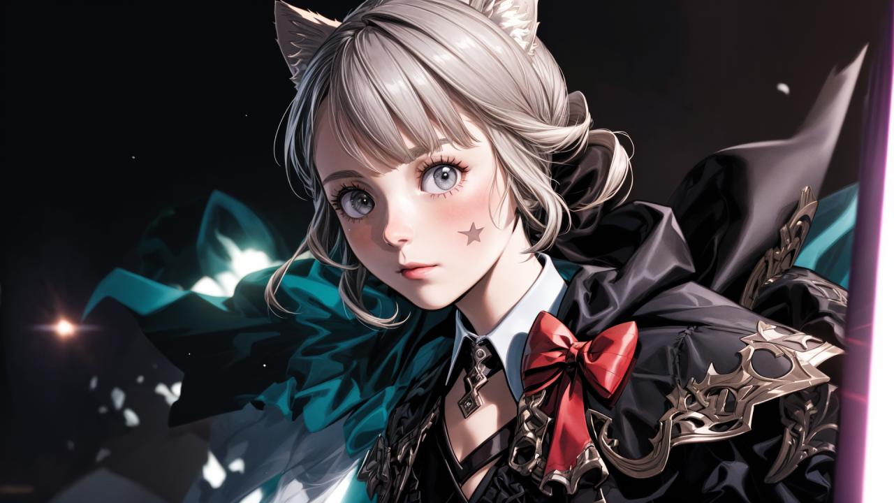 Prompt <lora:lynette02:1>1girl,lynette,hair bow,animal ears,grey hair,short hair,facial mark, bow,ribbon,capelet,black pantyhose, low ponytail, tail, ((heroic pose)),dynamic pose,depth of field, (circus background,light projectors),