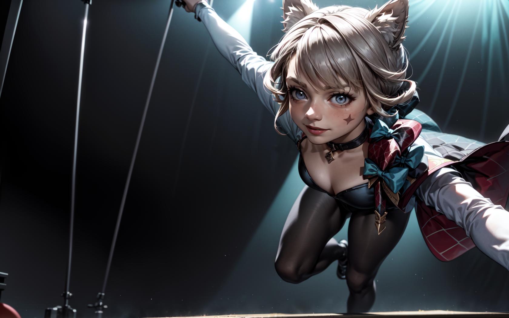 | Prompt | <lora:lynette02:1>1girl,lynette,hair bow,animal ears,grey hair,short hair,facial mark, bow,ribbon,capelet,black pantyhose, low ponytail, tail,