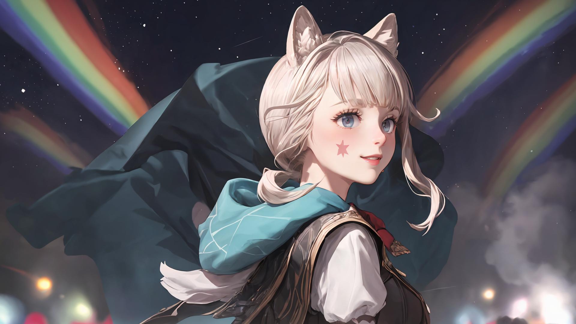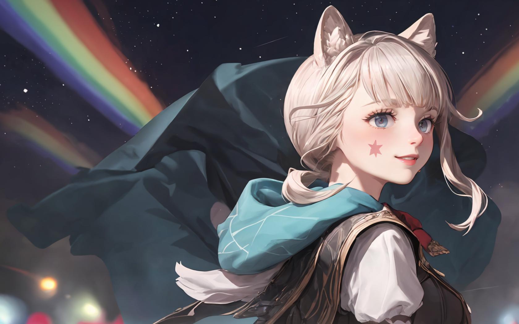 Prompt <lora:lynette02:1> 1girl,lynette,hair bow,animal ears,grey hair,short hair,facial mark, bow,ribbon,capelet,black pantyhose, low ponytail, tail, side view,aesthetic pose, happy, smiling, (front of circus big top,dissolving into ethereal, shimmering mist, iridescent rainbow paint:1.3), (((illuminated by celestial starlight))), fairground background,