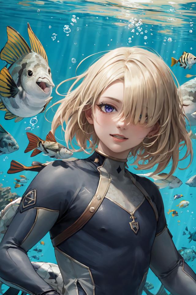 Prompt <lora:Freminet:0.8>freminet, 1boy, solo, short hair, hair over one eye, blonde hair, purple eyes,male focus,((mature)), ((scuba diving,swimming, dynamic pose)), happy,bubbles,fishes, underwater,
