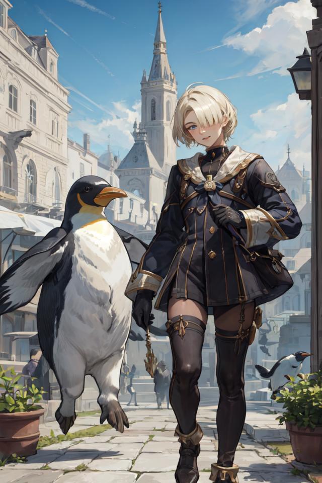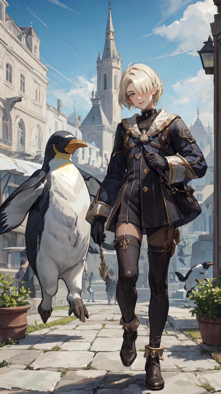 1girl, animal, bag, bangs, bird, black dress, black footwear, black gloves, blonde hair, blue eyes, blue sky, boots, building, buttons, cloud, day, double-breasted, dress, full body, gloves, hair over one eye, long sleeves, looking at viewer, outdoors, penguin , plant, potted plant, short hair, shoulder bag, sky, smile, solo, standing, thighhighs, walking