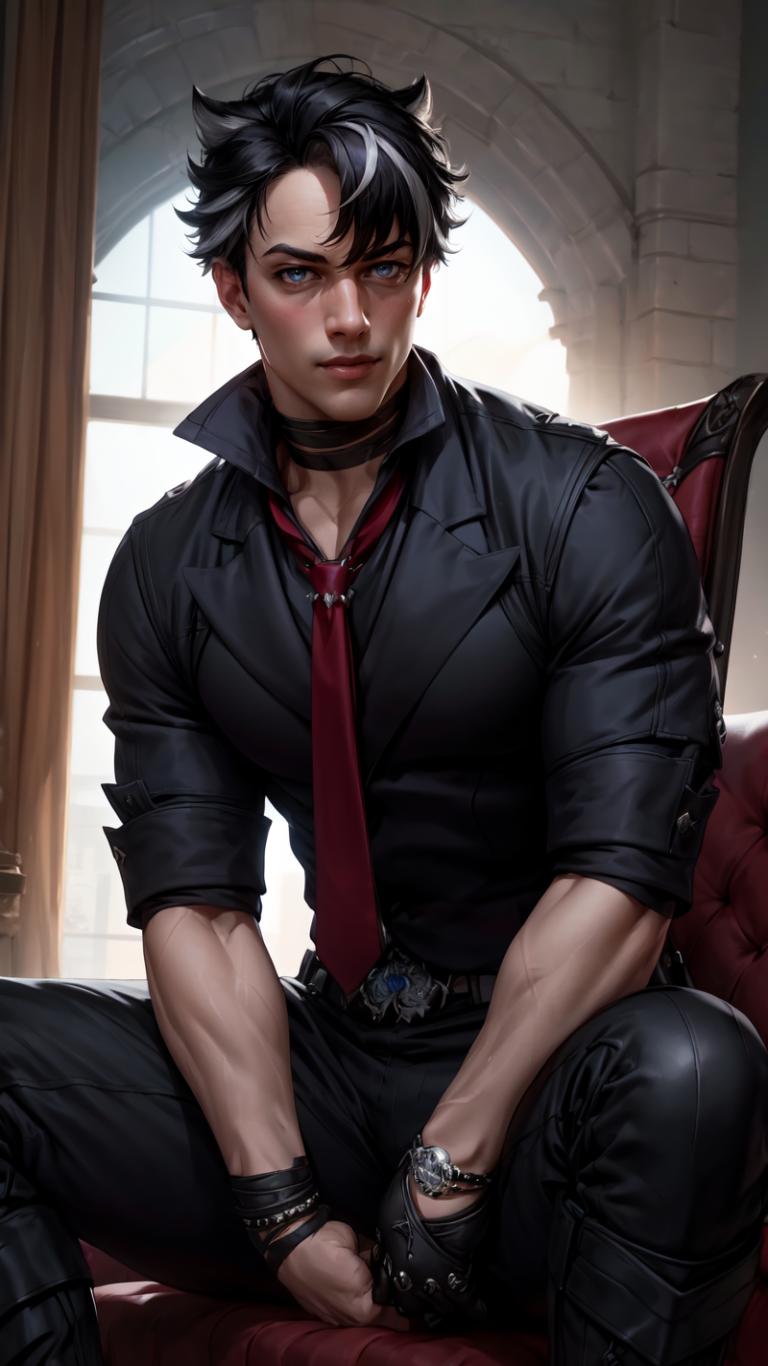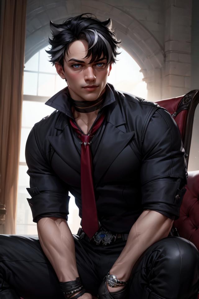 Prompt <lora:Wriothesley:1>wriothesley,1boy, black hair, multicolored hair, short hair, blue eyes ,collared shirt, red necktie, jewelry, black gloves, choker, black belt, black coat, boots, grey pants, sleeves rolled up, jacket, (man focus, muscular), sitting on armchair, extended legs on desk. inside rich victorian office, (majestic), sexy, seductive smile, looking at viewer,