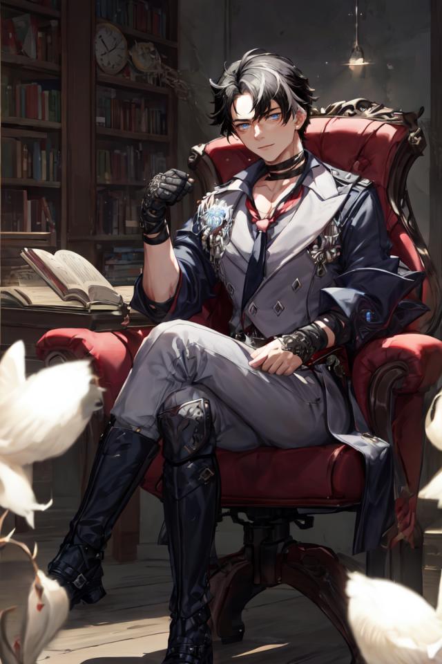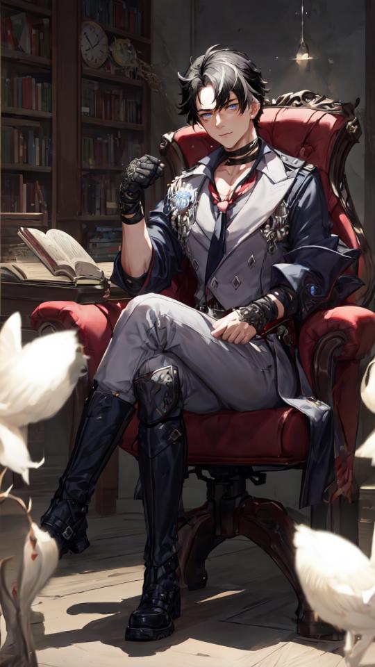 1boy, armchair, bangs, bird, black choker, black footwear, black gloves, black hair, blue eyes, book, bookshelf, boots, chair, choker, closed mouth, coat, collared shirt, crossed legs, full body, gloves, grey pants, hand up, holding, indoors, jacket, jewelry, knee boots, lamp, lapels , long sleeves, looking at viewer, male focus, multicolored hair, necktie, open book, pants, parted bangs, shirt, short hair, sitting, solo, streaked hair, vest, virtual youtuber, watch, white hair, white pants, white shirt