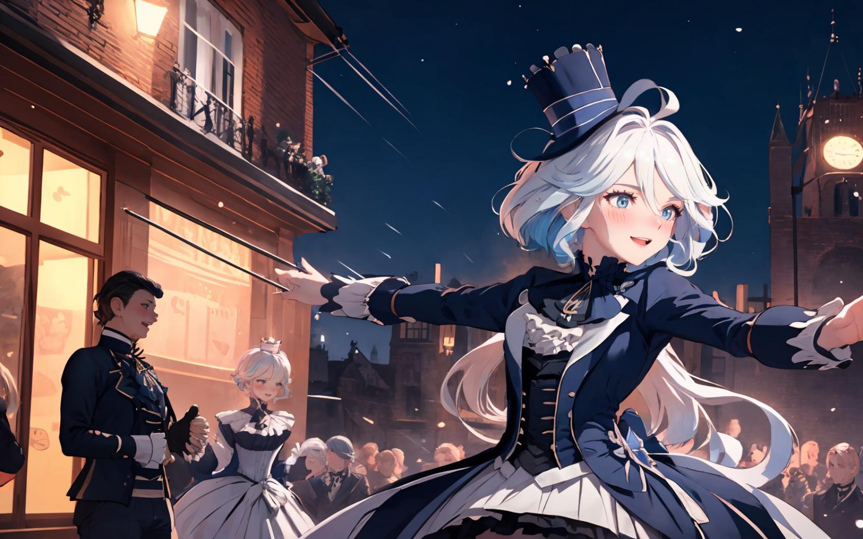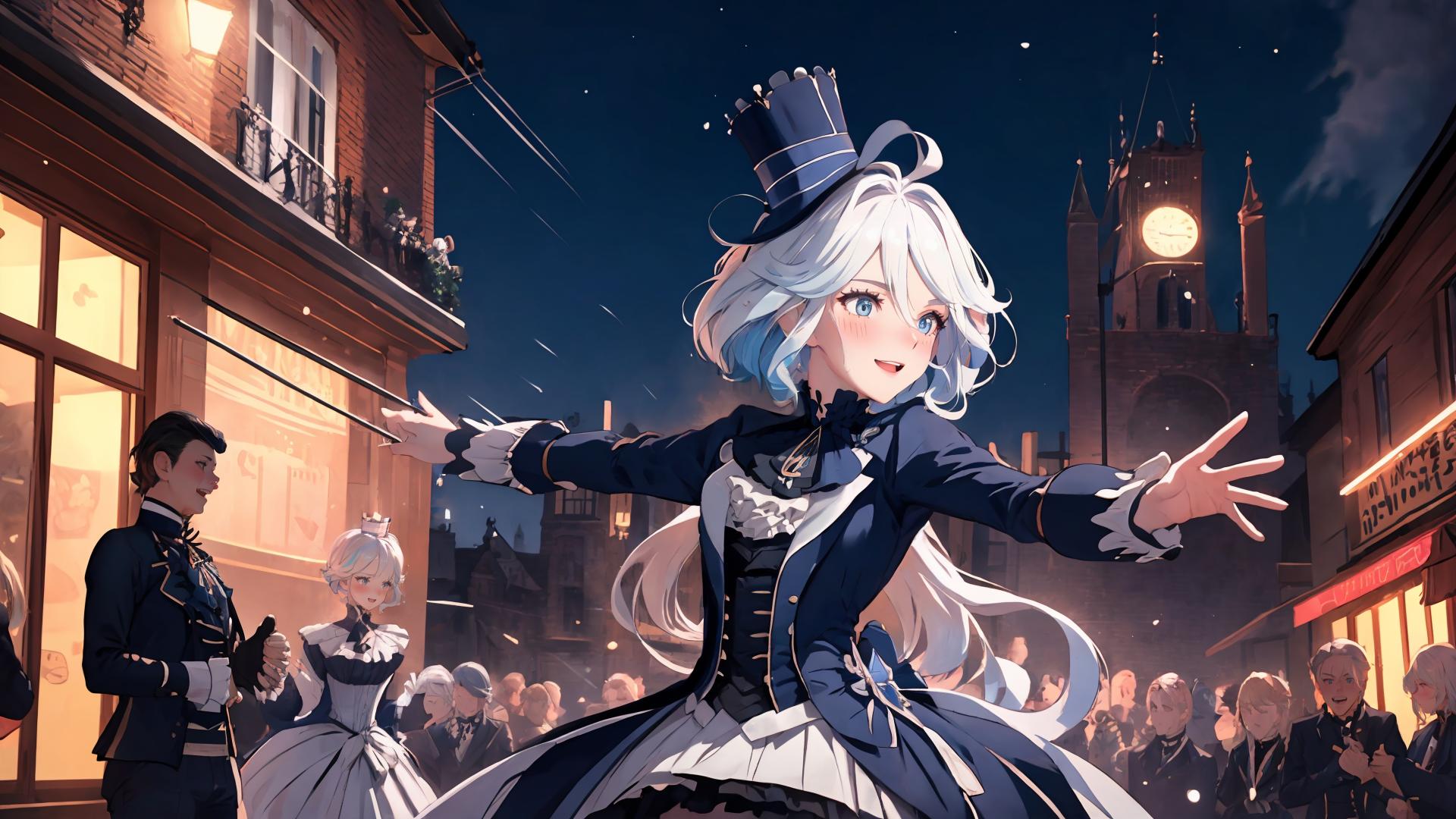 6+boys, 6+girls, :d, apron, ascot, bangs, black dress, black gloves, black hair, black jacket, blue eyes, blue headwear, blue jacket, blush, building, clock, clock tower , corset, crowd, dress, frills, gloves, hair between eyes, hat, jacket, long hair, long sleeves, maid, maid headdress, medium breasts, multiple boys, multiple girls, night, night sky, open clothes, open jacket, open mouth, outdoors, outstretched arms, puffy sleeves, shirt, short hair, skirt, sky, smile, solo focus, star (sky), starry sky, top hat, tower, very long hair, white dress, white gloves, white hair, white skirt