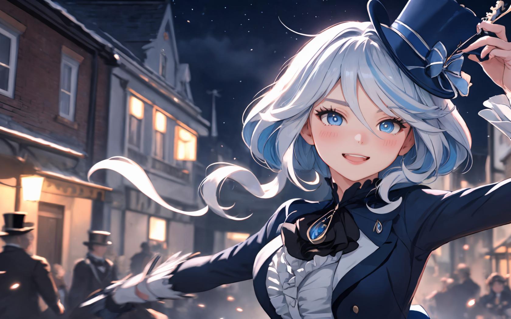 Prompt <lora:furina1:1>furinadef, big anime eyes,shy,kawai,(((expressive, theatrical))), blush,happy, ((dynamic, motion blur)), Speed lines,victorian crowd applausing, (((performing an outdoors theatrical piece at night))), (((victorian) white town background)),